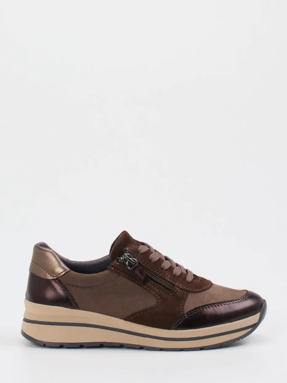 Alltag trifft auf stilvolle Leichtigkeit.Cypres Soft bietet mit diesem Damen-Komfort-Sneaker eine gelungene Verbindung aus Design und Funktion. Ideal für entspannte Alltagsmomente bietet der Schuh eine sportlich-runde Silhouette mit praktischem Reißverschluss. Das Nubukleder wirkt dank der samtigen Oberfläche hochwertig und wird durch glänzende Metallic-Einsätze an Zehenkappe und Ferse modern ergänzt. In warmem Schokobraun gehalten, betonen Ton-in-Ton-Nähte und der Materialmix aus matten und glänzenden Partien das ausgewogene Design. Die dämpfende Keilsohle und Weite H sorgen für angenehmen Tragekomfort, auch bei längeren Wegen. Stilistisch passt der Sneaker zu casual Jeans-Looks und herbstlichen Layering-Outfits. Mit durchdachtem Komfort und trendigen Details ist dieser Sneaker ein vielseitiger Begleiter aus dem Hause Cypres Soft.