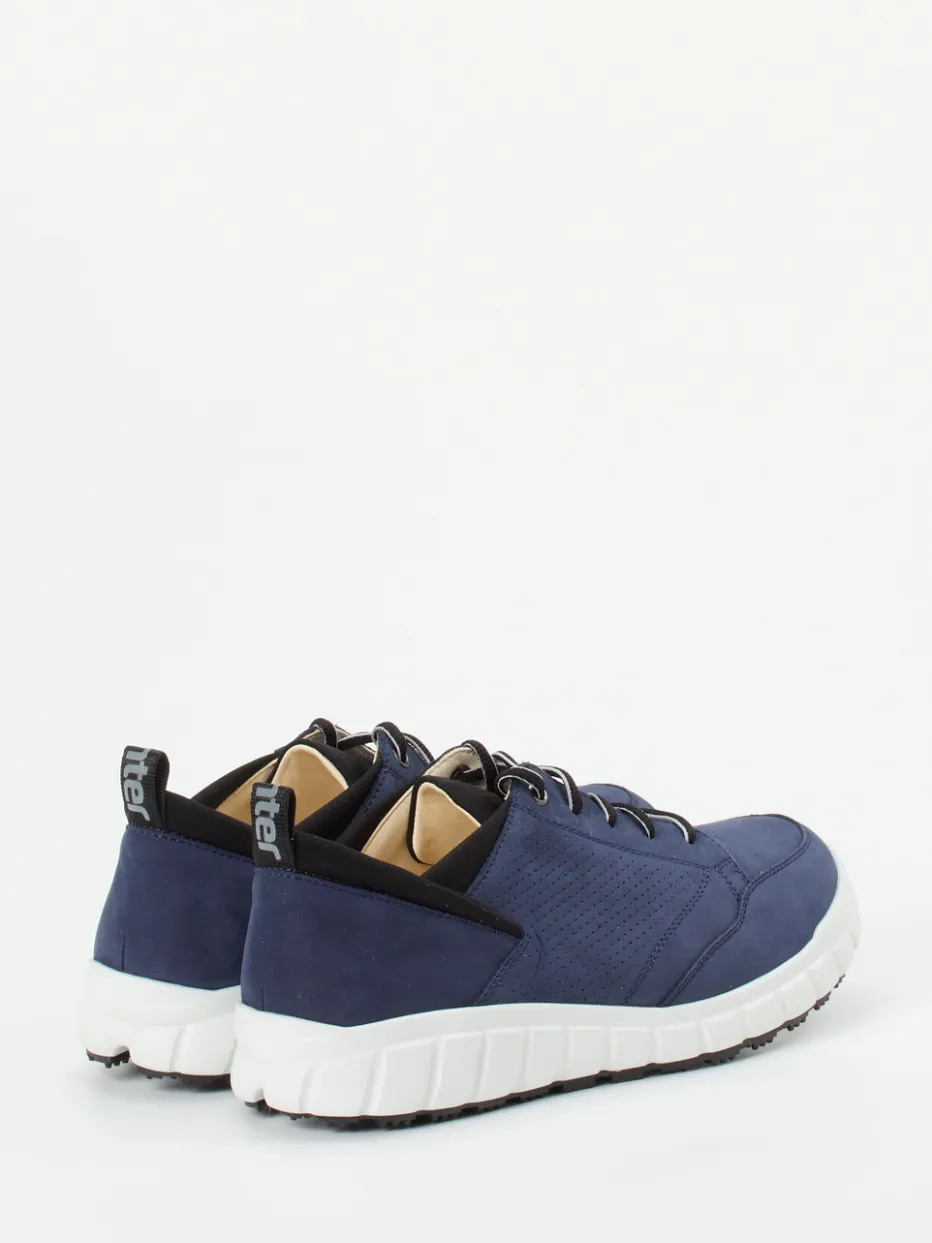 Flexibler Komfort für aktive Stunden.Der Komfort-Sneaker von Ganter überzeugt mit funktionalem Design und hochwertigem Material. Perfekt für lange Fußwege im Alltag oder bei leichten Outdoor-Aktivitäten bietet das Modell mit blauem, samtig angeschliffenem Nubukleder ein angenehm weiches Tragegefühl. Die klassische Form in Marineblau wird durch schwarze, reflektierende Schnürsenkel und kontrastierende Details akzentuiert. Eine gepolsterte Einstiegspartie mit Elastikeinsatz sowie die weiße, ergonomisch profilierte Gummisohle sorgen für besten Komfort. Der Streetwear-inspirierte Look passt ideal zu funktionaler Freizeitmode. Proportional geformt mit komfortabler Weite H und herausnehmbarem Korkfußbett – Qualität und Alltagstauglichkeit in Ganter-Manier.