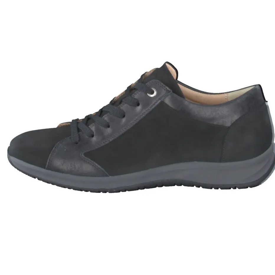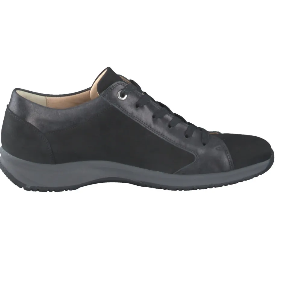 Schwarz, schlicht, komfortstark.Der Komfort-Sneaker von Hartjes überzeugt mit klassischer Silhouette und dezenten Highlights. Für entspannte Wege durch den Alltag bietet dieser Damen-Schnürschuh aus samtig angerautem Nubukleder und schimmerndem Metallicleder maximale Bequemlichkeit. In schlichtem Schwarz designt, ergänzt durch eine weiche Leder-Innenausstattung und eine graue Gummisohle mit leichter Keilform, verbindet er Stilsicherheit mit ergonomischem Laufkomfort. Details wie eine tonige Schnürung, Materialmix in matter Optik sowie eine dezente Metallöse am Einstieg akzentuieren die minimalistische Formgebung. Stilistisch ist das Modell ideal für die Capsule Wardrobe im Sinne von „Quiet Luxury“. Hartjes steht hier für langlebige Materialien und durchdachtes Komfortdesign.