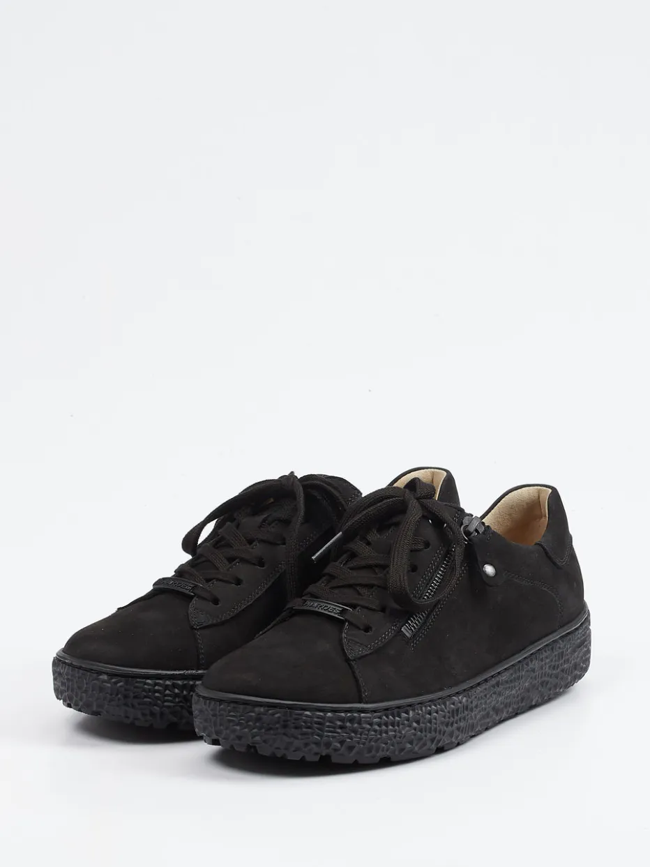 Minimalistisch. Komfortorientiert. Raffiniert.Der Damen-Komfort-Sneaker von Hartjes verbindet Designanspruch mit angenehmer Alltagstauglichkeit. Ein seitlicher Reißverschluss erleichtert den Einstieg und ergänzt die klassische Schnürung funktional. Das schwarze Nubukleder präsentiert sich samtig angeschliffen und wird von Ton-in-Ton-Nähten dezent akzentuiert. Die profilierte Gummisohle mit strukturiertem Rand bringt Flexibilität und Trittsicherheit – ideal für Freizeitaktivitäten und entspannte Wege. Dank H-Weite und herausnehmbarer Innensohle eignet sich das Modell auch für orthopädische Einlagen. Inspiriert vom Quiet-Luxury-Trend unterstreicht der cleane Look eine stilbewusste Casual-Ausrichtung. Hartjes steht für maximalen Komfort mit natürlicher Leichtigkeit.