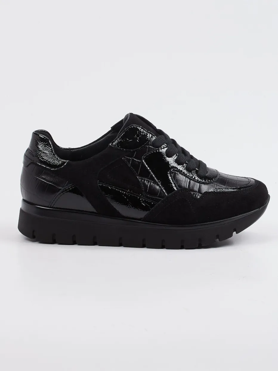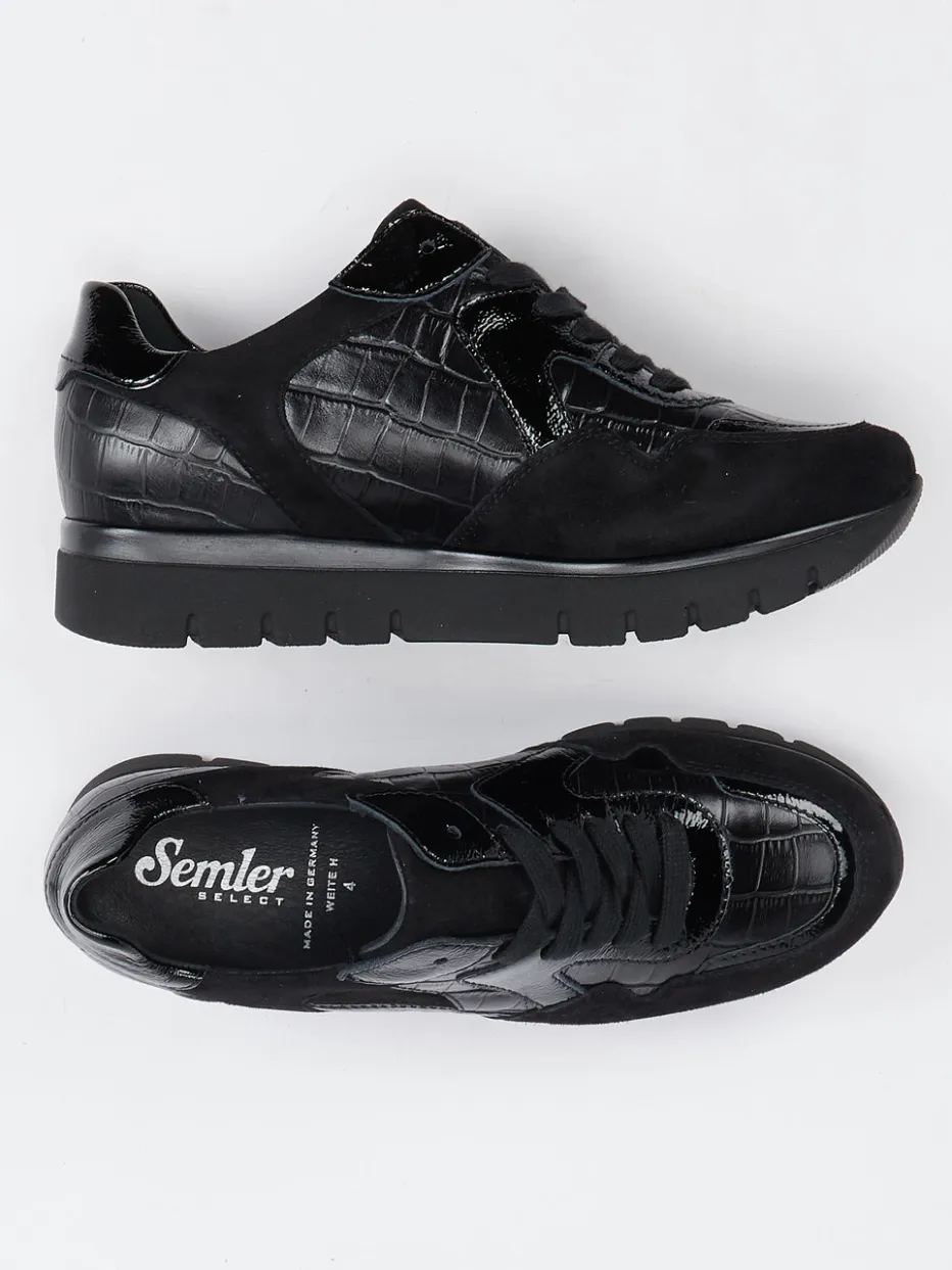 Eleganter Komfort im Ton-in-Ton-Look.Semler präsentiert diesen schwarzen Komfort-Sneaker für Damen mit stilvoller Krokoprägung und bequemer Ausstattung. Ideal für lange Tage im Büro oder entspannte Stadtgänge – das Modell bietet durch die Kombination aus hochwertigem Reptilleder mit glänzender Krokostruktur und mattem Veloursleder angenehmen Tragekomfort. Die klassische runde Form, breite Schnürung und profilierte PU-Sohle mit Luftpolster garantieren Trittsicherheit und Stabilität. Texturkontraste und tonale Schwarznuancen betonen einen eleganten Streetwear-Stil im Sinne des Quiet Luxury. Dank herausnehmbarem Fußbett auch für Einlagen geeignet. Starke Funktion trifft auf urbane Linienführung mit Anspruch an Stil und Qualität.
