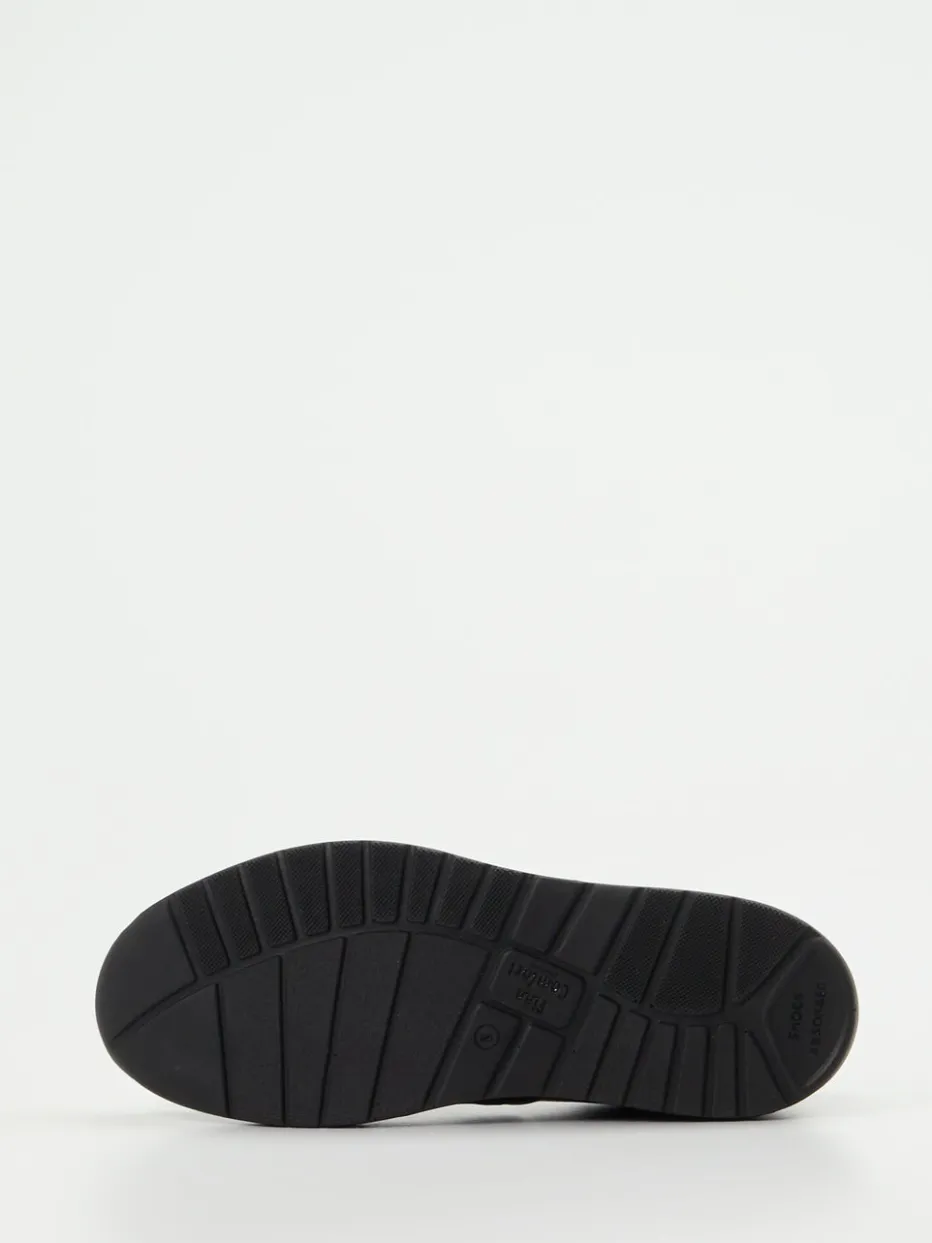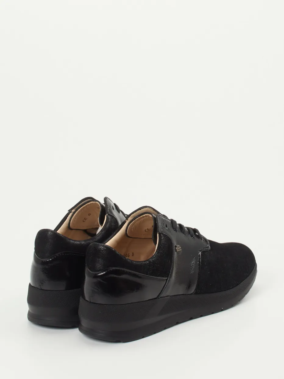 Moderner Komfort für Alltag und Büro.Finn Comfort präsentiert einen stilvollen Komfort-Sneaker für Damen. Ob im hektischen Berufsalltag oder beim Stadtbummel – dieses Modell vereint weich gepolsterten Laufkomfort mit dezenter Eleganz. Das Obermaterial aus schwarzem Stretch wird durch glänzende Lackleder-Elemente kontrastreich akzentuiert, während Veloursleder-Partien dem Design eine matte Tiefe verleihen. Eine ergonomisch geformte Profilsohle sorgt für zuverlässige Trittsicherheit, das austauschbare Kork-Fußbett unterstützt individuellen Komfort. Die dezente Ton-in-Ton-Optik und das zurückhaltende Markenlogo unterstreichen den klaren Streetwear-inspirierten Look. Ein souverän stilvoller Schuh mit funktionaler Substanz – typisch Finn Comfort.