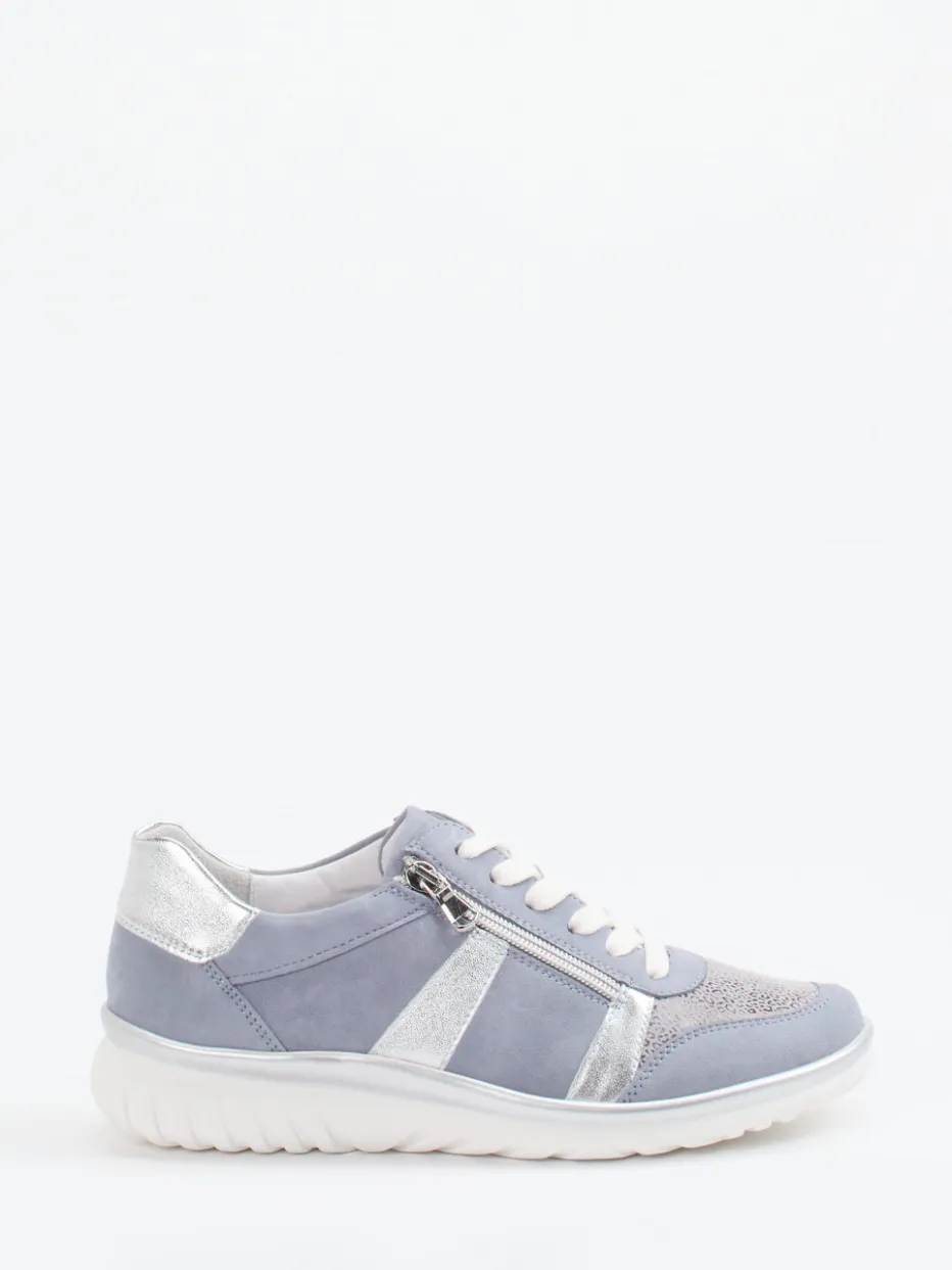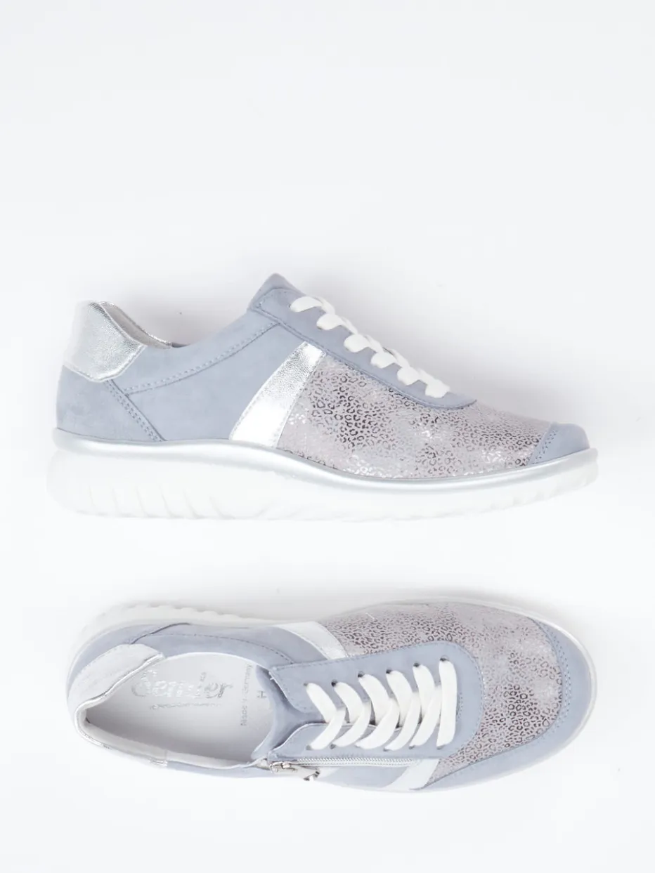 Bequemer Stil in sanftem Pastell.Semler präsentiert diesen Komfort-Sneaker für Damen in modischem Pastellblau. Ideal für entspannte Alltagslooks überzeugt das Modell mit einem Mix aus dehnfähigem Stretch und samtig angeschliffenem Veloursleder. Die matt strukturierte Oberfläche wird durch silberne Metallic-Einsätze und einen schimmernden Animal-Print im Vorderfußbereich akzentuiert. Die klassische Rundform mit zusätzlichem Reißverschluss neben der Schnürung vereinfacht das Anziehen. Innen sorgt ein Leder-/Textilfutter mit Weite H für angenehmen Tragekomfort, auch für Einlagen geeignet. Die PU-Sohle mit leichtem Profil unterstreicht den sportlich-leichten Charakter des Designs. Ein funktionaler Freizeitschuh mit modischem Understatement – typisch Semler.