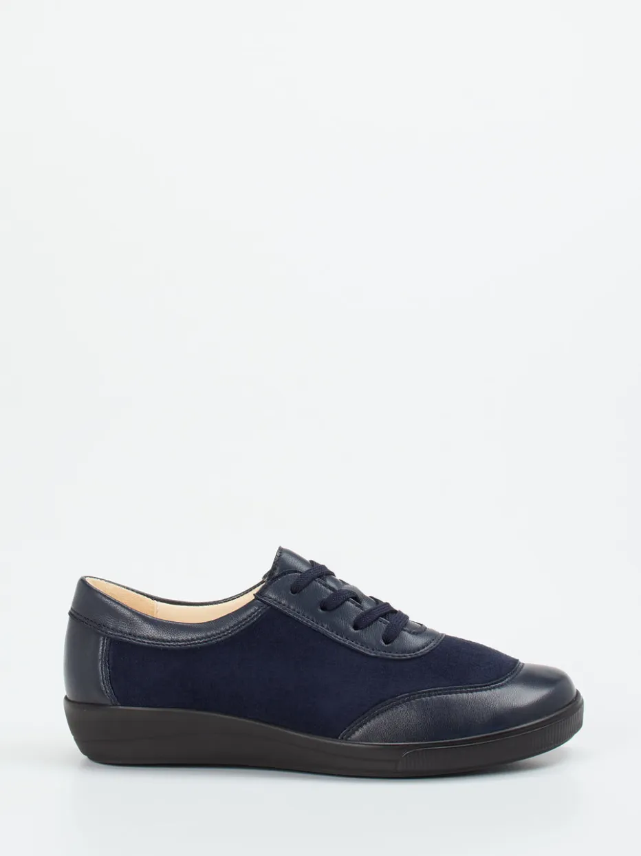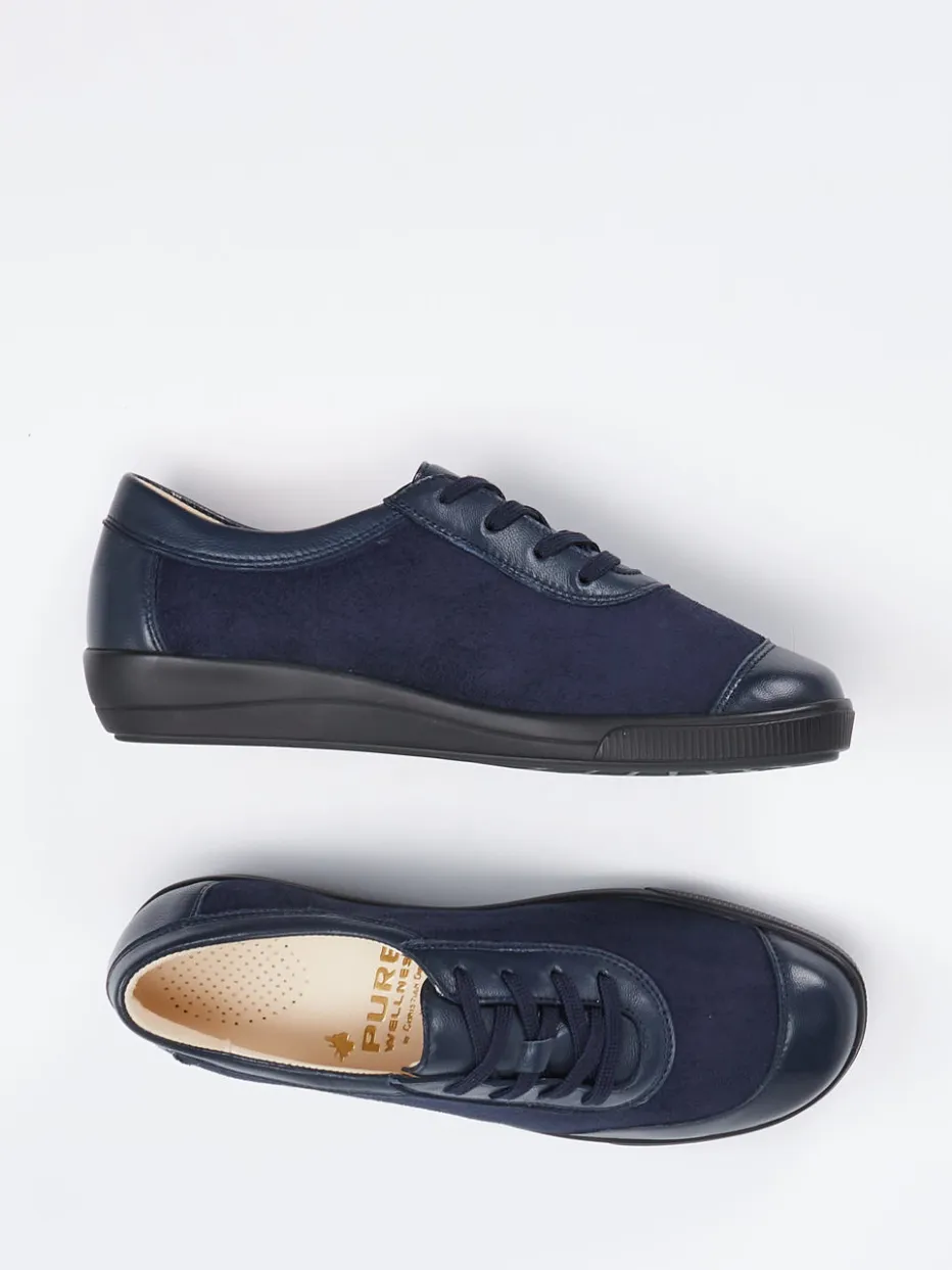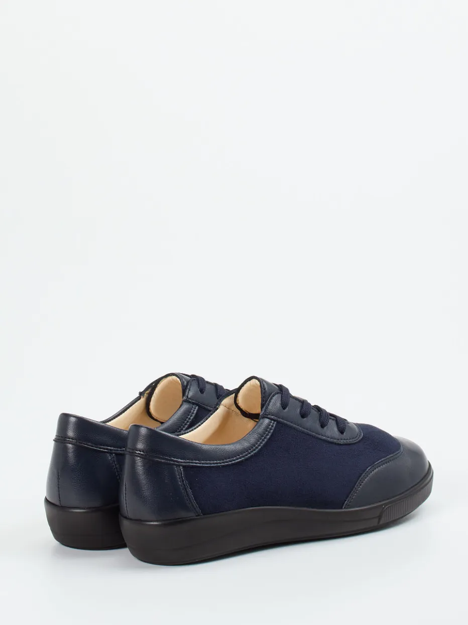 Minimalistischer Komfort für jeden Tag.Christian Dietz präsentiert einen Damen-Komfort-Sneaker mit betont ergonomischer Silhouette. Für längere Wege oder aktiven Alltag: Das Stretchleder in Kombination mit nachtblauem Glatt- und Veloursleder – zum Teil samtig angeraut – schafft flexiblen Halt und angenehme Bewegungsfreiheit. Dunkelblau gehalten, zeigt sich das Design bewusst zurückhaltend mit toniger Schnürung, runder Form und strukturierter, weißer Gummisohle samt rotem Shock Absorber. Ein weich gepolsterter Schaftrand und das herausnehmbare Korkfußbett unterstreichen die komfortable Ausstattung. Stilistisch passt der Sneaker zu entspannten, casual-orientierten Outfits. Christian Dietz steht hier für funktionale Eleganz mit spürbarem Komfortanspruch.