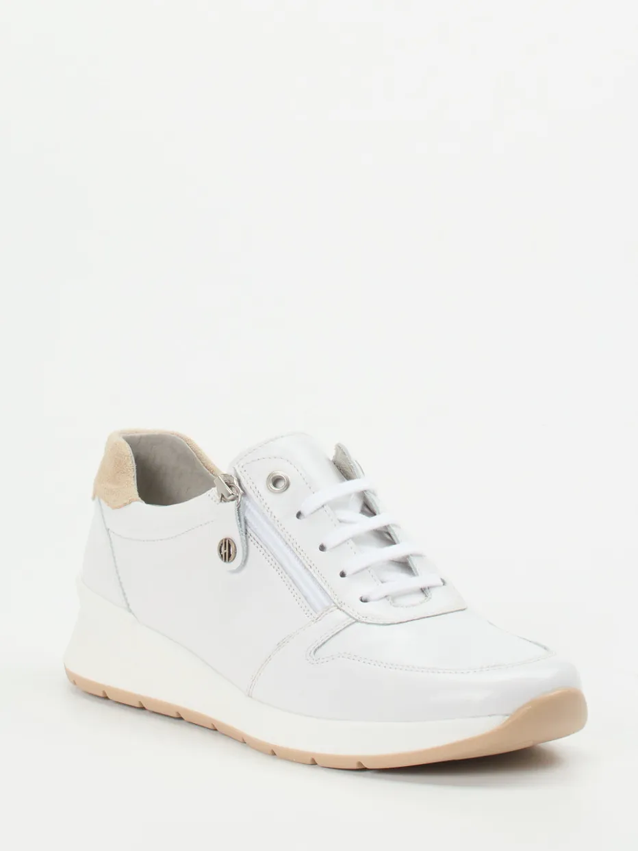 Stilvoll beweglich durch den Alltag.Die Marke Hickersberger präsentiert einen komfortorientierten Damen-Sneaker mit zeitgemäßem Minimalismus. Ob beim Stadtbummel oder auf dem Weg ins Café – das weiße Stretchleder mit glänzender Oberfläche bietet in Kombination mit dem gepolsterten Velours-Fersenbereich angenehme Flexibilität und sanften Halt. Ein seitlicher Reißverschluss ergänzt die Schnürung funktional. Die sportlich-klassische Silhouette wird durch dezente Beigenuancen akzentuiert, während das rutschhemmende Gummiprofil gelenkschonende Stabilität gibt. Entspanntes Freizeitstyling mit modischer Leichtigkeit passt ideal dazu – etwa mit weißer Stretch-Jeans und hellen Crossbody-Bags. Flexibler Komfort und müheloses Zumnorde-Design für bewegte Tage.