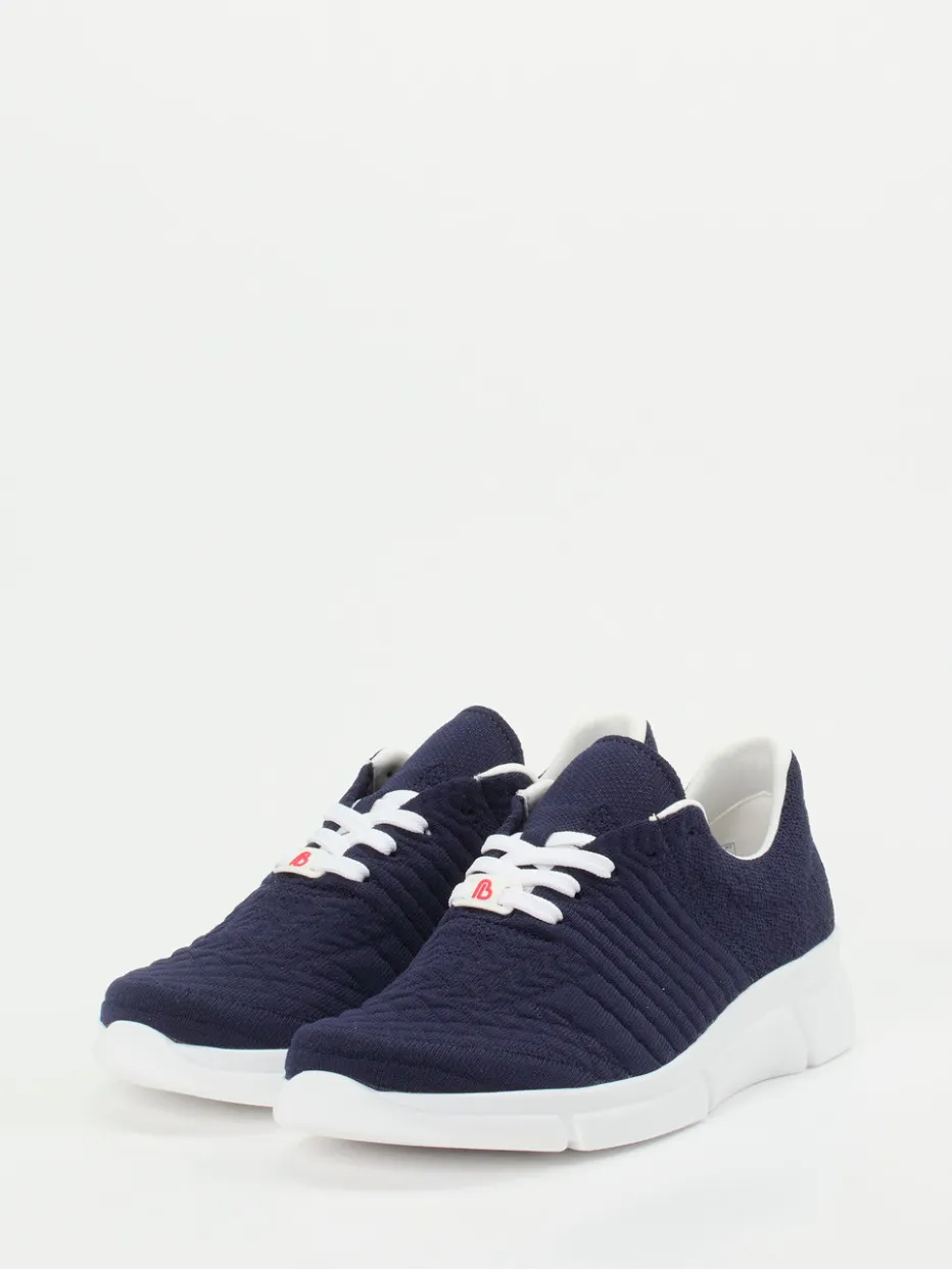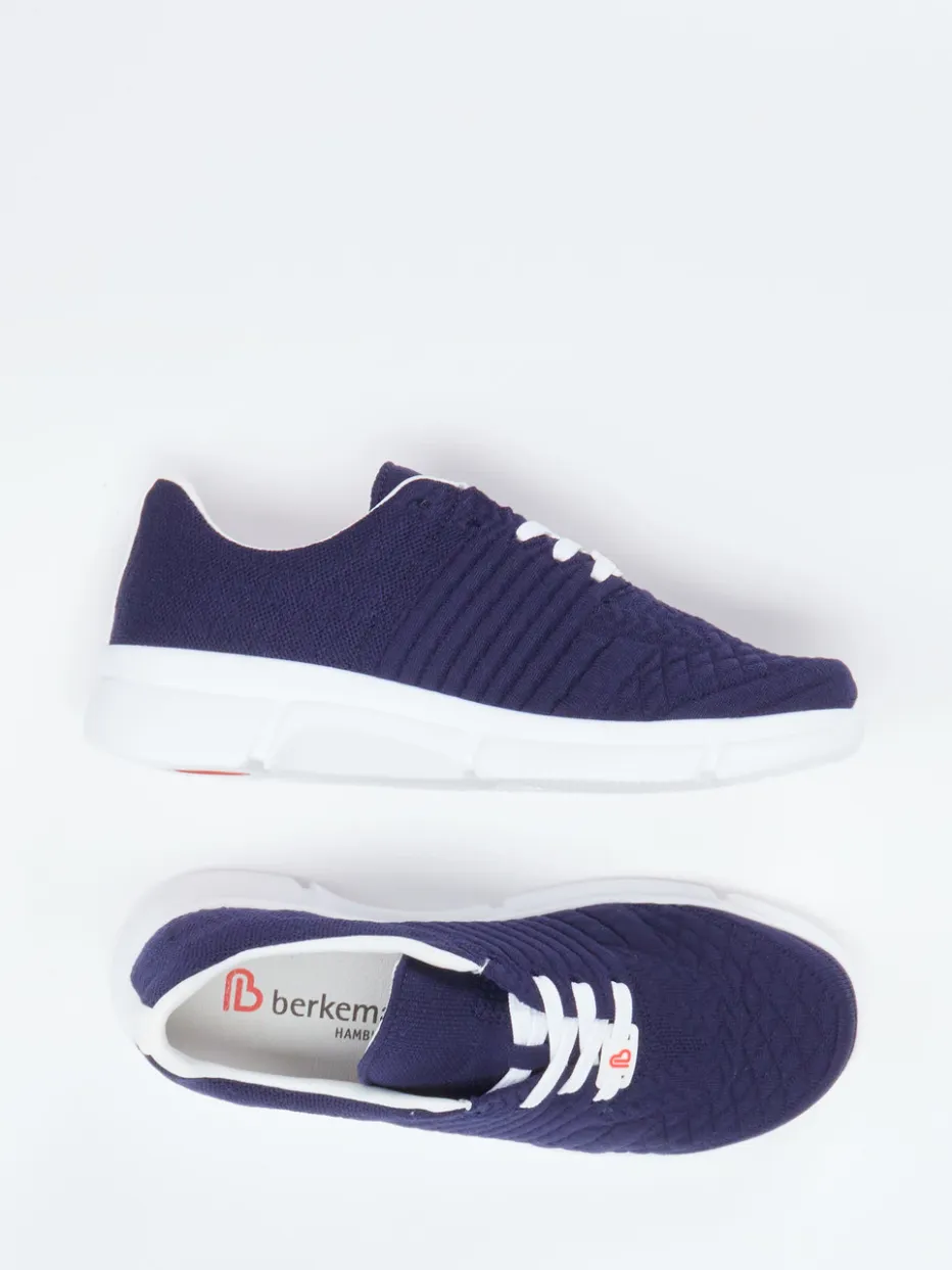 Sommerkomfort trifft klare Linien.Der Komfort-Sneaker von Berkemann überzeugt als bequemer Freizeitschuh mit moderner Athleisure-Anmutung. Für entspannte Alltagsmomente sorgt das luftige Textilmaterial in samtig strukturierter Strickoptik – ergänzt durch eine flexibel gearbeitete, weiße Kontrastsohle. Das klassische Marineblau wird durch weiße Schnürung und rote Logodetails aufgelockert. Eine gepolsterte Innensohle und Weite H garantieren komfortablen Sitz, während das herausnehmbare Fußbett individuelle Anpassung erlaubt. Der flache, minimalistisch designte Schuh fügt sich ideal in quiet activewear Looks ein. Perfekt kombiniert mit sportiven Basics oder lässiger Homewear. Ein komfortorientierter Sneaker mit Berkemann-typischer Ergonomie für den Alltag.