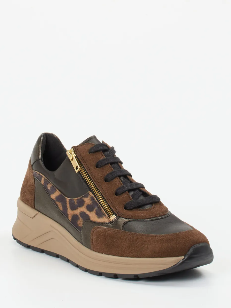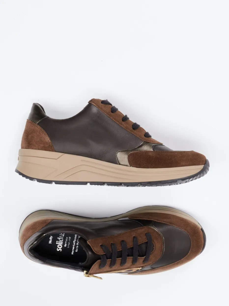 Stilvoller Komfort mit grafischem Akzent.Der Damen-Komfortsneaker von Solidus verbindet modische Raffinesse mit funktionellem Tragekomfort. Ideal für aktive Alltagssituationen, in denen Gehkomfort und Stil gefragt sind: Das Modell kombiniert braunes Veloursleder mit glatt glänzendem Kalbleder und einem markanten Leo-Druck auf Drucklederbasis. Eine sportlich-voluminöse Silhouette, tonal abgestufte Brauntöne und ein goldfarbener Reißverschluss prägen das Design. Dank H-Weite, gepolsterter Ferse und luftgepolstertem Korkfußbett entsteht ein angenehmes Laufgefühl – passgenau auch für eigene Einlagen. Der urbane Animal-Print liegt voll im Herbsttrend und harmoniert besonders gut mit warmtonigen Basics. Solidus steht hier für durchdachten Komfort in trendbewusster Ausführung.