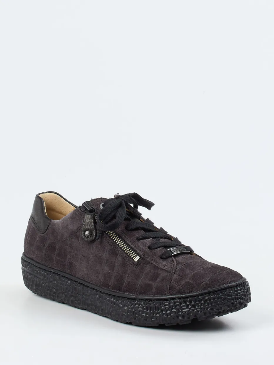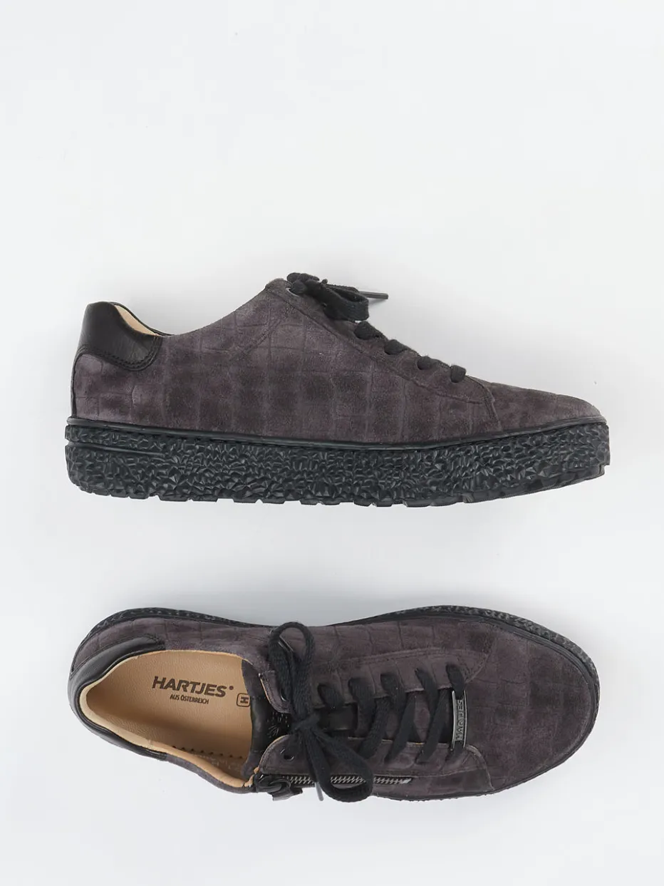 Unaufdringlicher Stil mit Komfortfaktor.Hartjes präsentiert einen Damen-Komfort-Sneaker in breiter Weite H. Ein Modell für Tage, an denen lässiger Stil und bequeme Ausstattung gefragt sind: Das geprägte Veloursleder in Anthrazitgrau wirkt durch die matte Krokostruktur modisch und dezent zugleich, während feine Glattlederdetails Akzente setzen. Der seitliche Reißverschluss ermöglicht ein unkompliziertes Anziehen, die profilierte Gummisohle unterstützt durch stabilen Grip. Die klassische, runde Form erinnert an minimalistische Streetwear, ihre dunkle Farbgebung integriert sich harmonisch in herbstliche Casual-Looks. Herausnehmbares Fußbett und nachhaltige Materialwahl machen diesen Sneaker zur komfortablen Wahl mit Qualitätsanspruch von Hartjes.