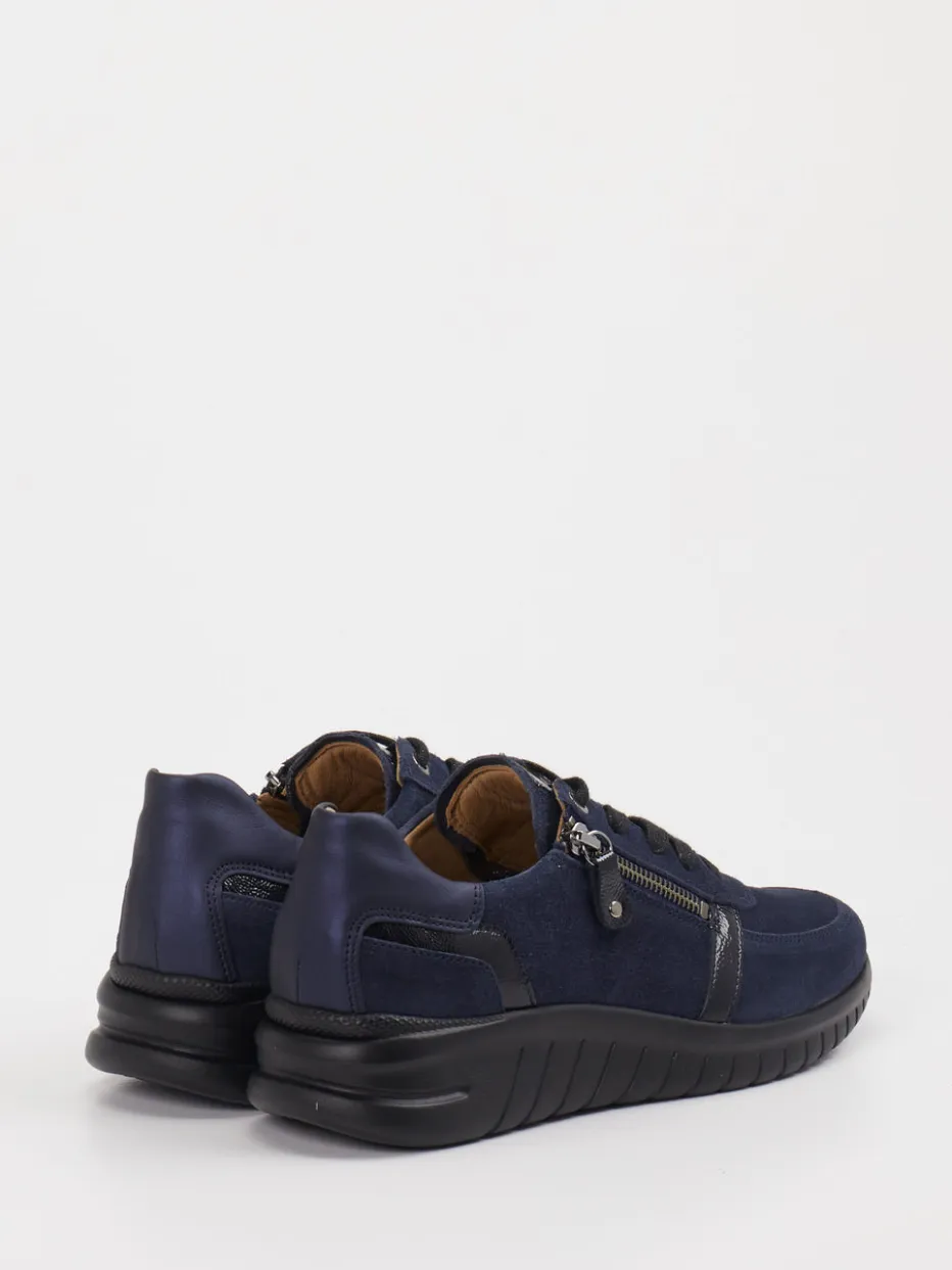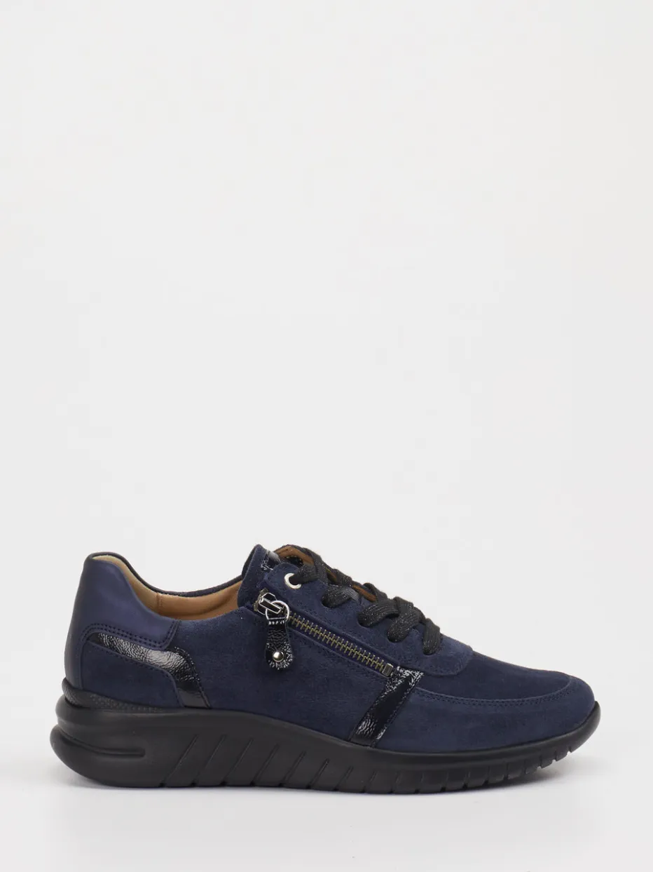 Bequem durch den Tag mit dezenter Raffinesse. Hartjes präsentiert einen Komfort-Sneaker für Damen aus samtigem Veloursleder. Ideal für den Alltag, überzeugt dieses Modell durch seine ergonomische Form und komfortable Ausstattung. Das dunkelblaue Obermaterial aus Veloursleder wirkt in Kombination mit schwarzen Glanzdetails schlicht und hochwertig. Ein seitlicher Reißverschluss ergänzt die Schnürung und erleichtert den Einstieg, während die gepolsterte Ferse zusätzlichen Tragekomfort bietet. Die profilierte Gummisohle sorgt für guten Halt, das Lederinnenfutter unterstreicht die atmungsaktive Verarbeitung. Dezente Minimalismus-Anklänge machen den Sneaker kombinationsstark für entspannte Freizeit-Outfits. Komfort-Design von Hartjes für anspruchsvolle Wohlfühlmomente.