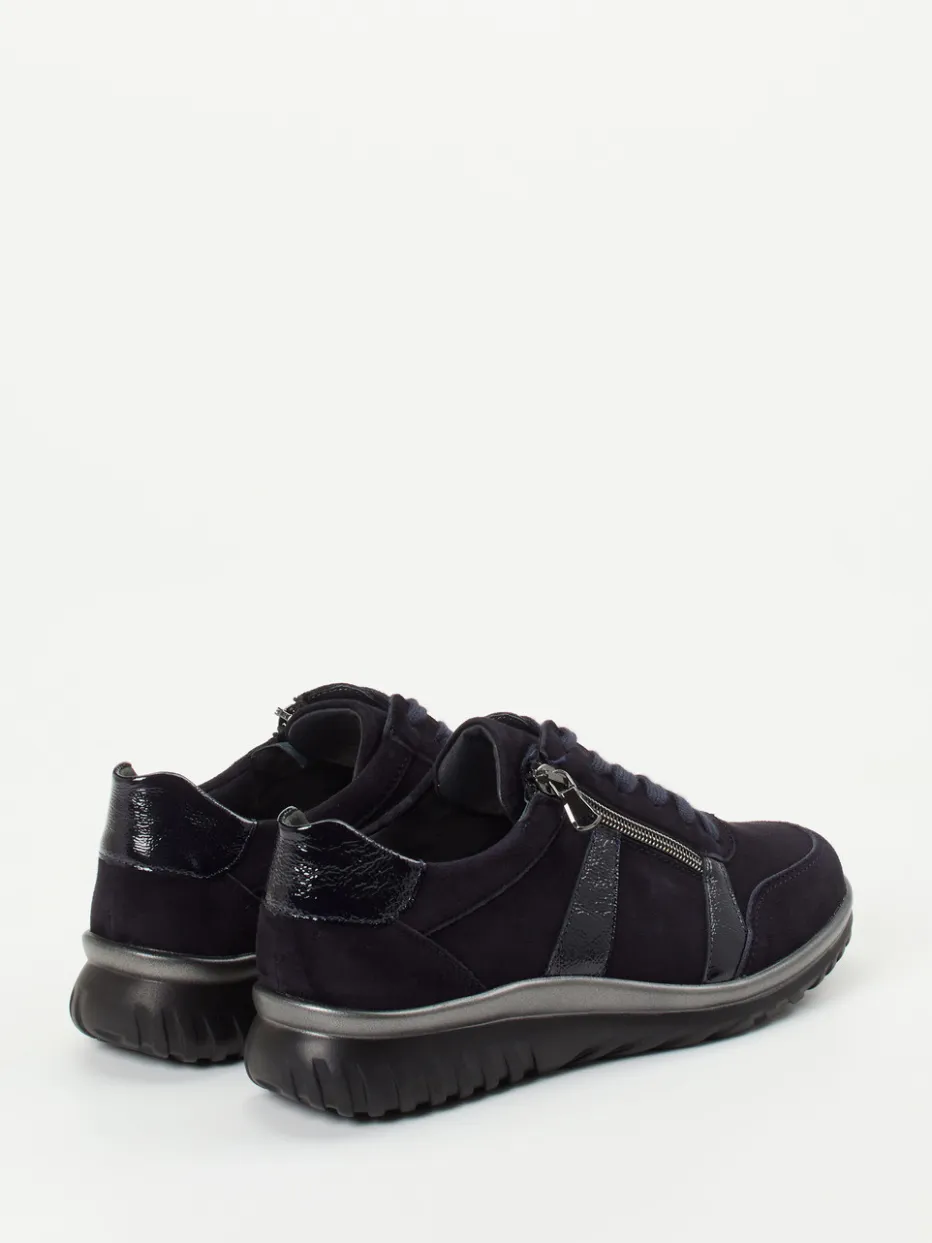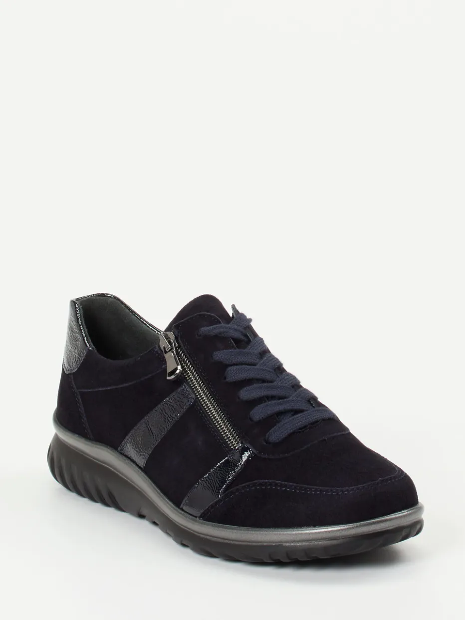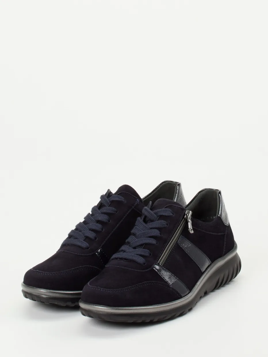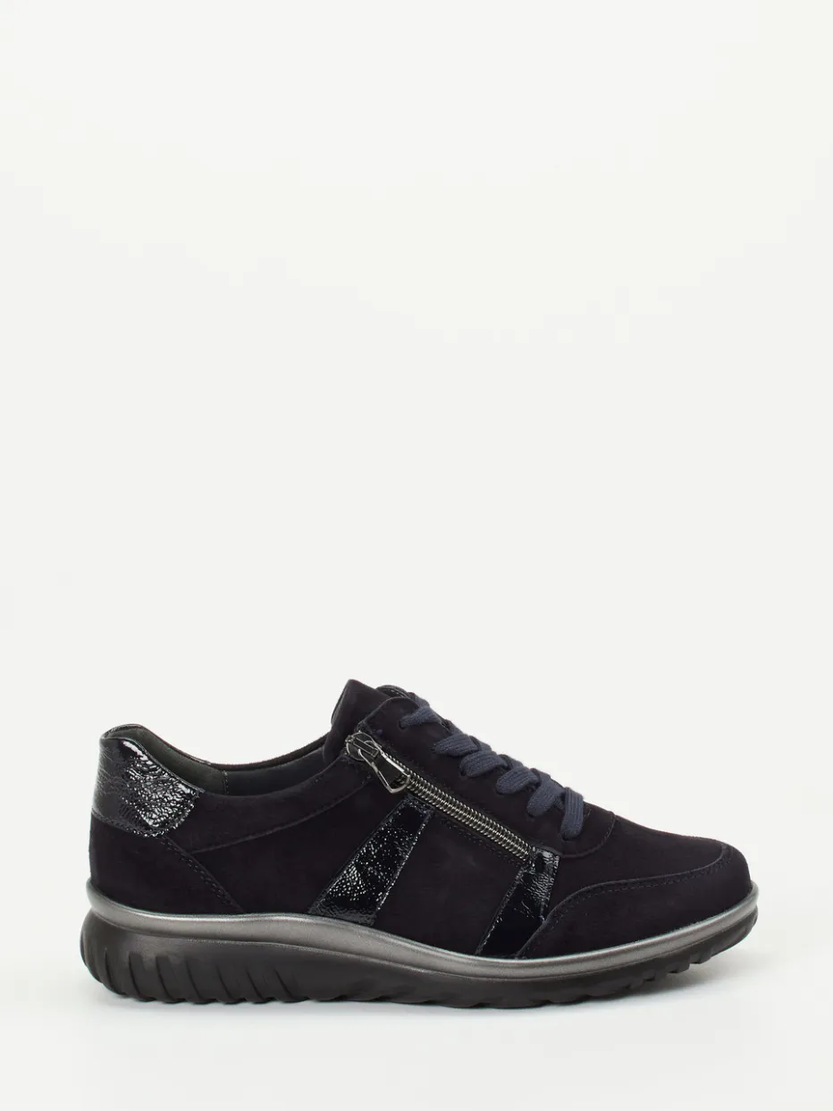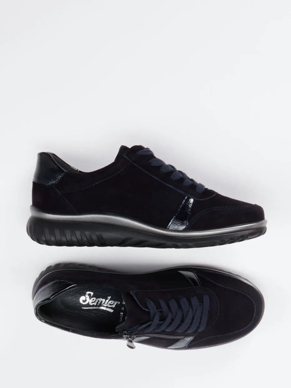 Eleganter Alltagskomfort trifft auf dezente Highlights.Die Marke Semler präsentiert mit diesem Damen-Komfort-Sneaker ein attraktives Modell für entspannte Tage. Ideal für längere Stadtspaziergänge oder entspannte Freizeitaktivitäten überzeugt der Schuh durch weiches Veloursleder, das in tiefem Dunkelblau eine ruhige Eleganz verströmt. Glänzende Lackleder-Akzente an Ferse und Außenseite setzen dezente visuelle Akzente. Die ergonomisch geformte PU-Laufsohle dämpft angenehm, der seitliche Reißverschluss mit toniger Schnürung erleichtert das Anziehen. Die breite K-Weite und das herausnehmbare Fußbett betonen den Fokus auf Komfort. Kombiniert hervorragend zu grauen oder blautonigen Outfits. Ein funktionaler Sneaker mit semlertypischer Passform und stilbewusster Zurückhaltung.
