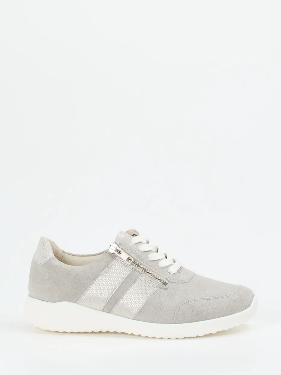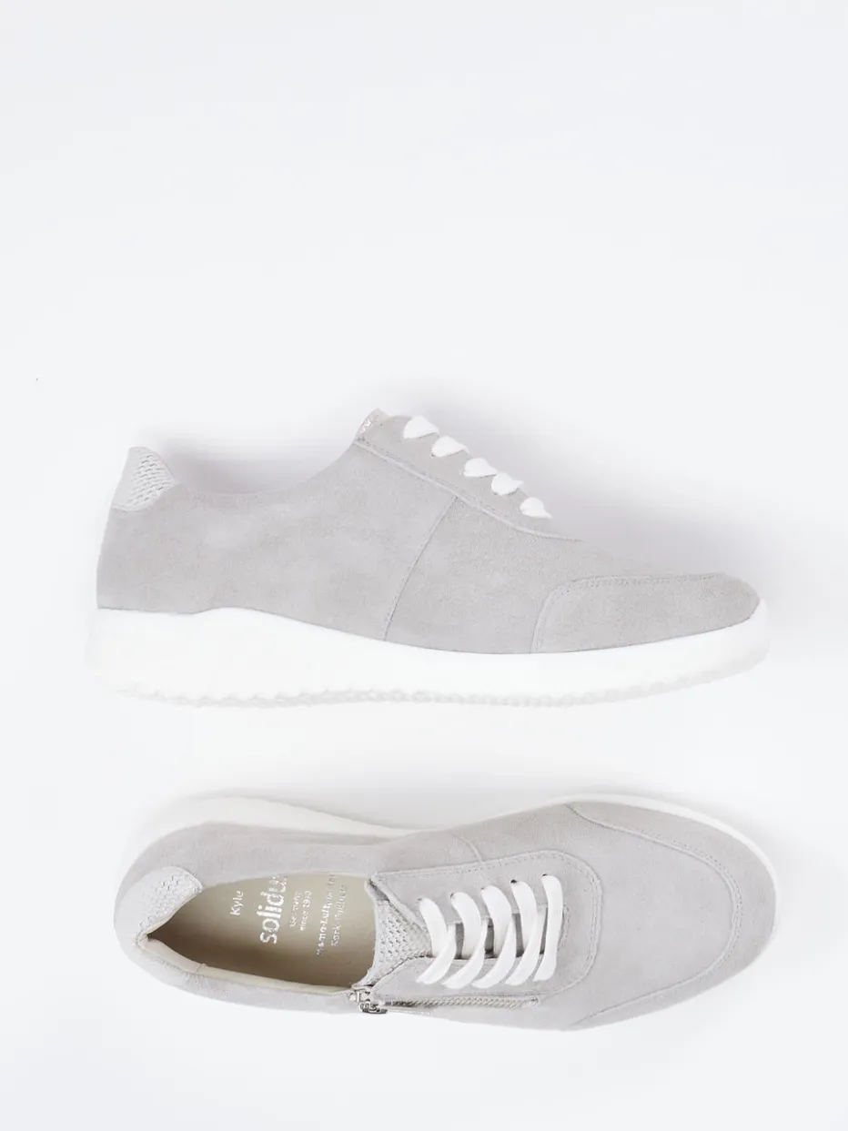 Komfort trifft sportlichen Minimalismus.Solidus präsentiert hier einen modischen Komfort-Sneaker für Damen. Klassisch in hellgrauem Veloursleder gehalten, verbindet das Modell sportliches Design mit funktionaler Alltagstauglichkeit. Die samtig-matte Oberfläche, kombiniert mit weißen Akzenten und einem seitlichen Reißverschluss, sorgt für ein stimmiges, reduziertes Gesamtbild. Zarte Steppnähte und strukturierte Textilstreifen unterstreichen die zurückhaltende Dynamik. Innen bietet ein Leder-/Textilfutter zusammen mit der flexiblen Soft-Gummi-Sohle höchsten Gehkomfort – auch für Einlagen geeignet. Der Look passt zur Soft-Neutrals-Ästhetik der Saison. Ein atmungsaktiver Bequemschuh mit markentypischer Passform für entspannte Alltagseinsätze.