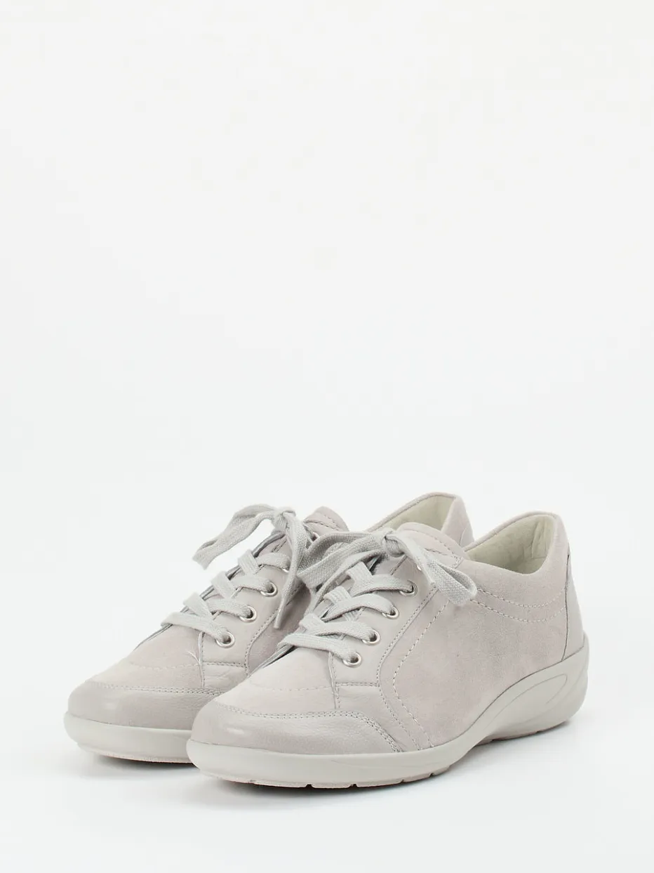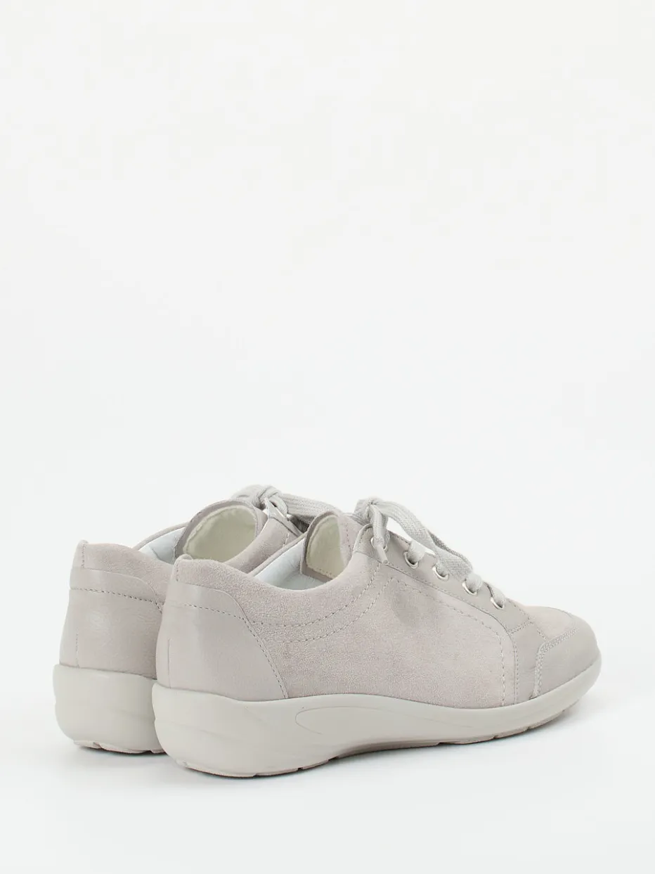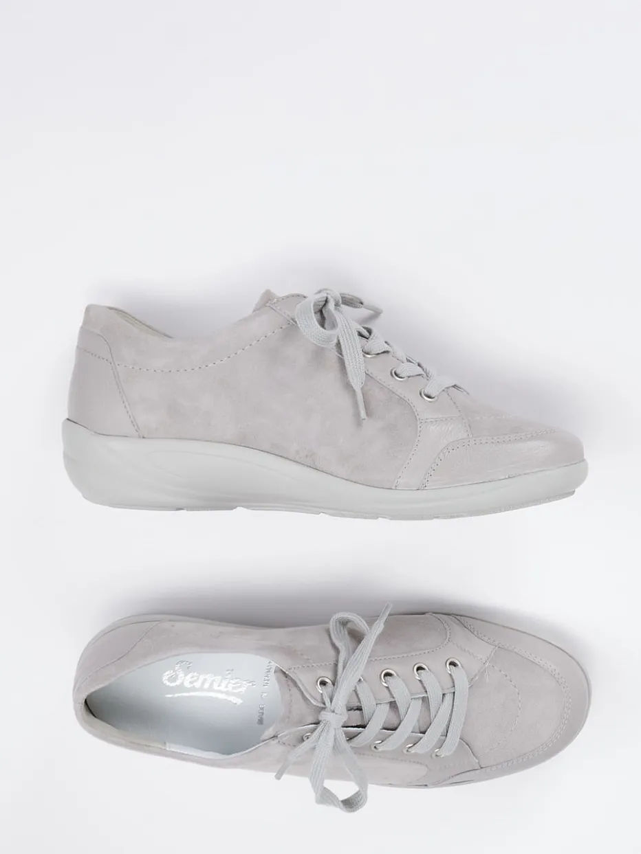 Der Komfort-Sneaker von Semler vereint dezente Ästhetik mit funktionalem Design. Gefertigt aus hochwertigem Veloursleder, das samtig angeschliffen ist, überzeugt das Modell in einem hellgrauen Ton mit matter Oberfläche. Die abgerundete Silhouette, Metallösen, Ton-in-Ton-Nähte und der gepolsterte Schaftrand unterstreichen seine komfortorientierte Gestaltung. Eine ergonomische PU-Sohle mit rutschhemmendem Profil unterstützt langes Gehen und Stehen. Der Sneaker passt ideal zu minimalistischen Casual-Looks und verkörpert mit seiner leisen Eleganz den „Quiet Luxury“-Trend der Saison.