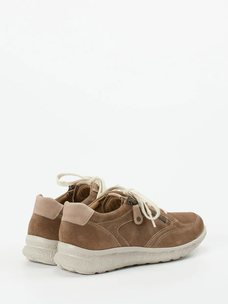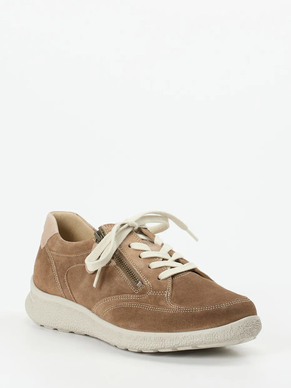 Durchdachtes Design für entspannte Tage. Hartjes präsentiert einen Damen-Schnürschuh aus der Komfortlinie, gefertigt aus hochwertigem Veloursleder. Der mittelbraune Farbton harmoniert mit cremefarbenen Schnürsenkeln und einer hellen Luftpolstersohle im funktionalen Stil. Seitlicher Reißverschluss und gepolsterter Fersenbereich ermöglichen ein bequemes An- und Ausziehen. Die ergonomische Silhouette mit rutschhemmender Sohle eignet sich ideal für bewegte Alltagssituationen. Der Schuh passt zu entspannten Casual-Outfits in Naturtönen. Höchster Komfort im Alltag – authentisch, natürlich, komfortbewusst.