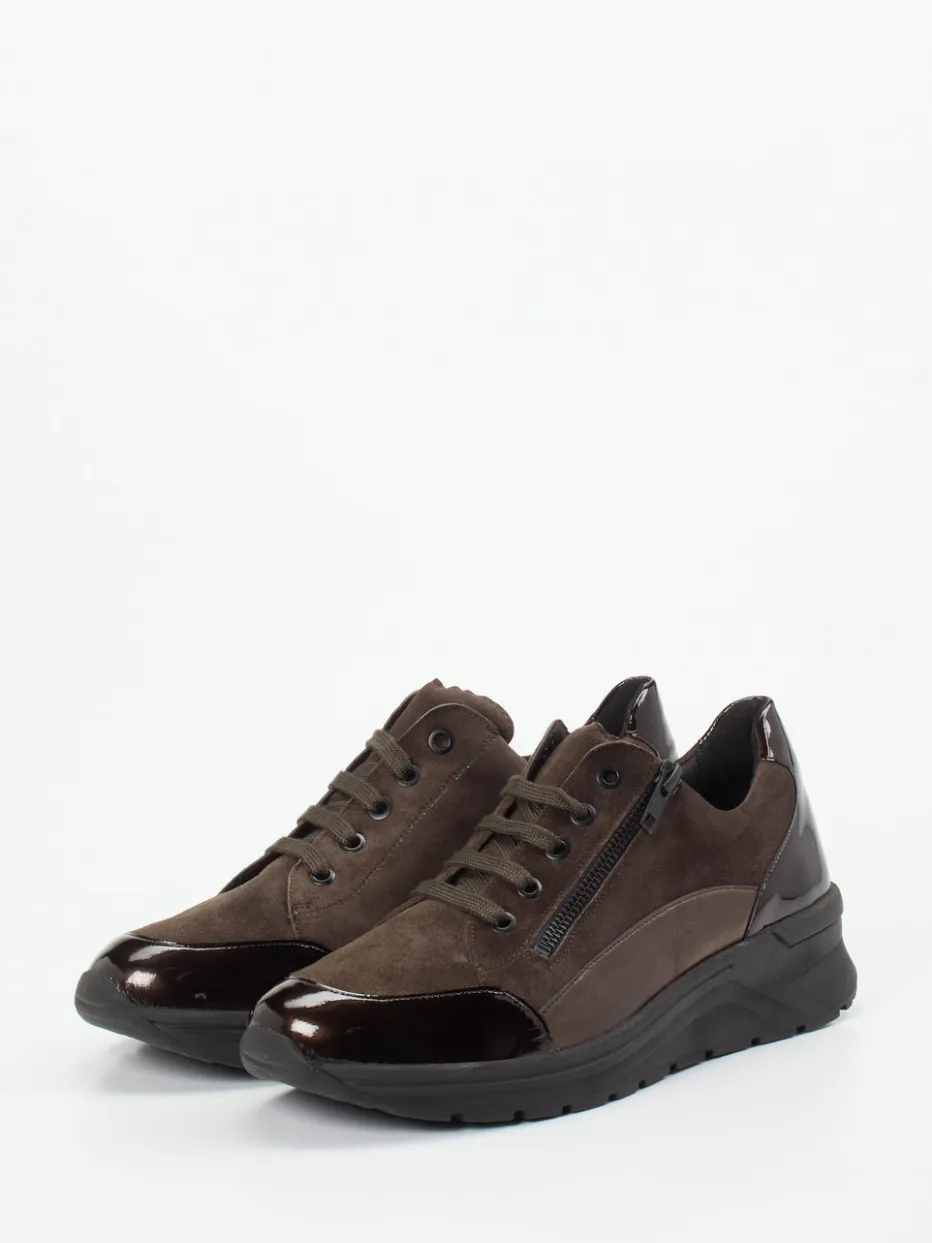 Materialmix mit Funktionalität vereint.Die Marke Solidus präsentiert diesen komfortablen Damen-Sneaker in voluminös-sportlicher Silhouette. Für langen Alltagskomfort sorgt hochwertiges Veloursleder, das in Mokka-Ton matt schimmert und mit glänzenden Lackakzenten kontrastiert. Ein seitlicher Reißverschluss ergänzt die Ton-in-Ton-Schnürung und ermöglicht leichtes Anziehen. Die profilierte Gummisohle mit solidus-Branding ist rutschhemmend und bringt sicheren Halt auf herbstlichen Wegen. Verstärkte Fersenpartien erhöhen den Tragekomfort zusätzlich. Der dezente Metallic-Schimmer an der Seite verleiht dem Modell moderne Tiefe. Optimal kombinierbar zu entspannten Streetwear-Looks oder minimalistischen Outfits. Solidus steht für durchdachte Passform und stilvolle Alltagsschuhe mit Komfortanspruch.