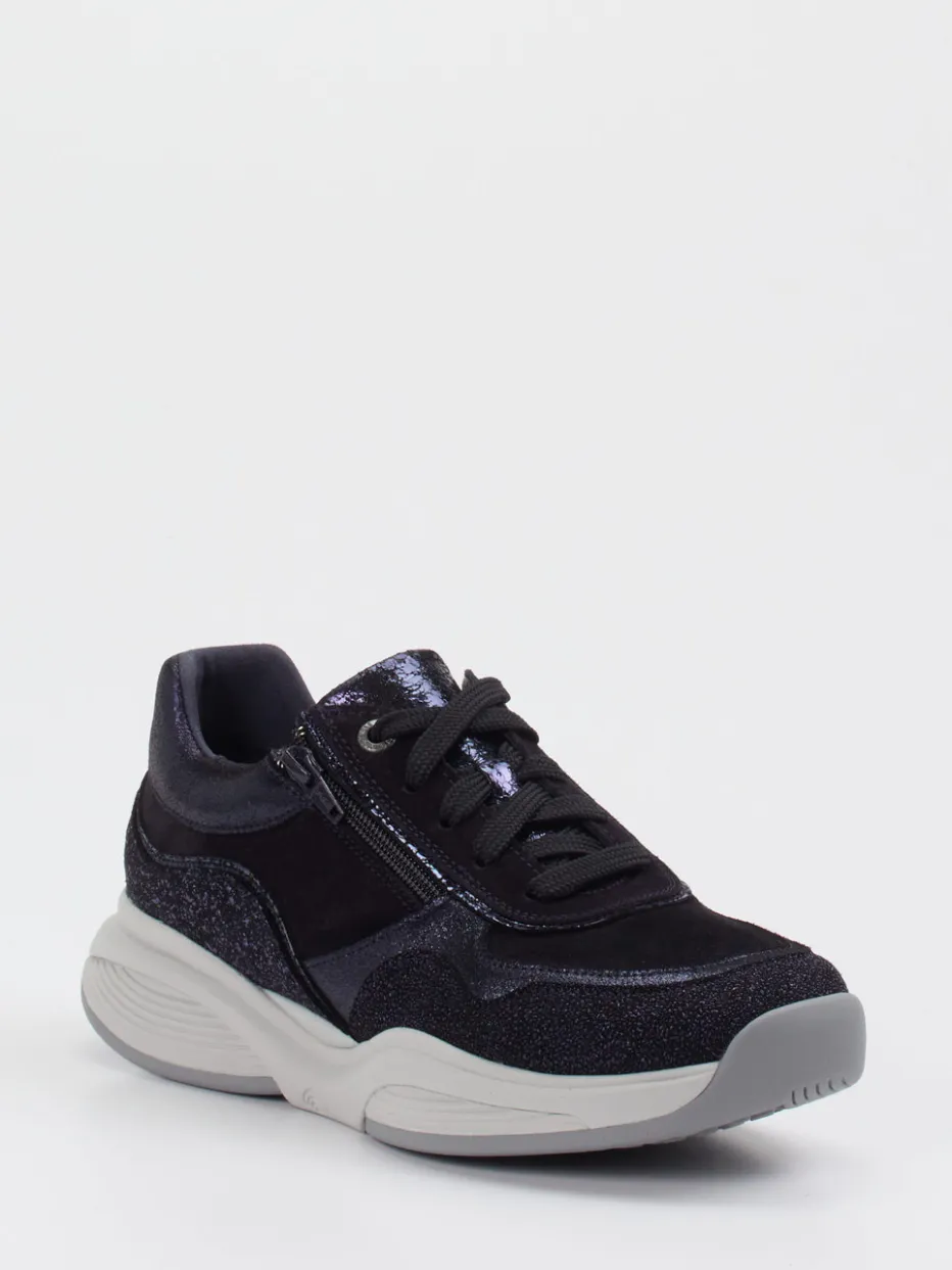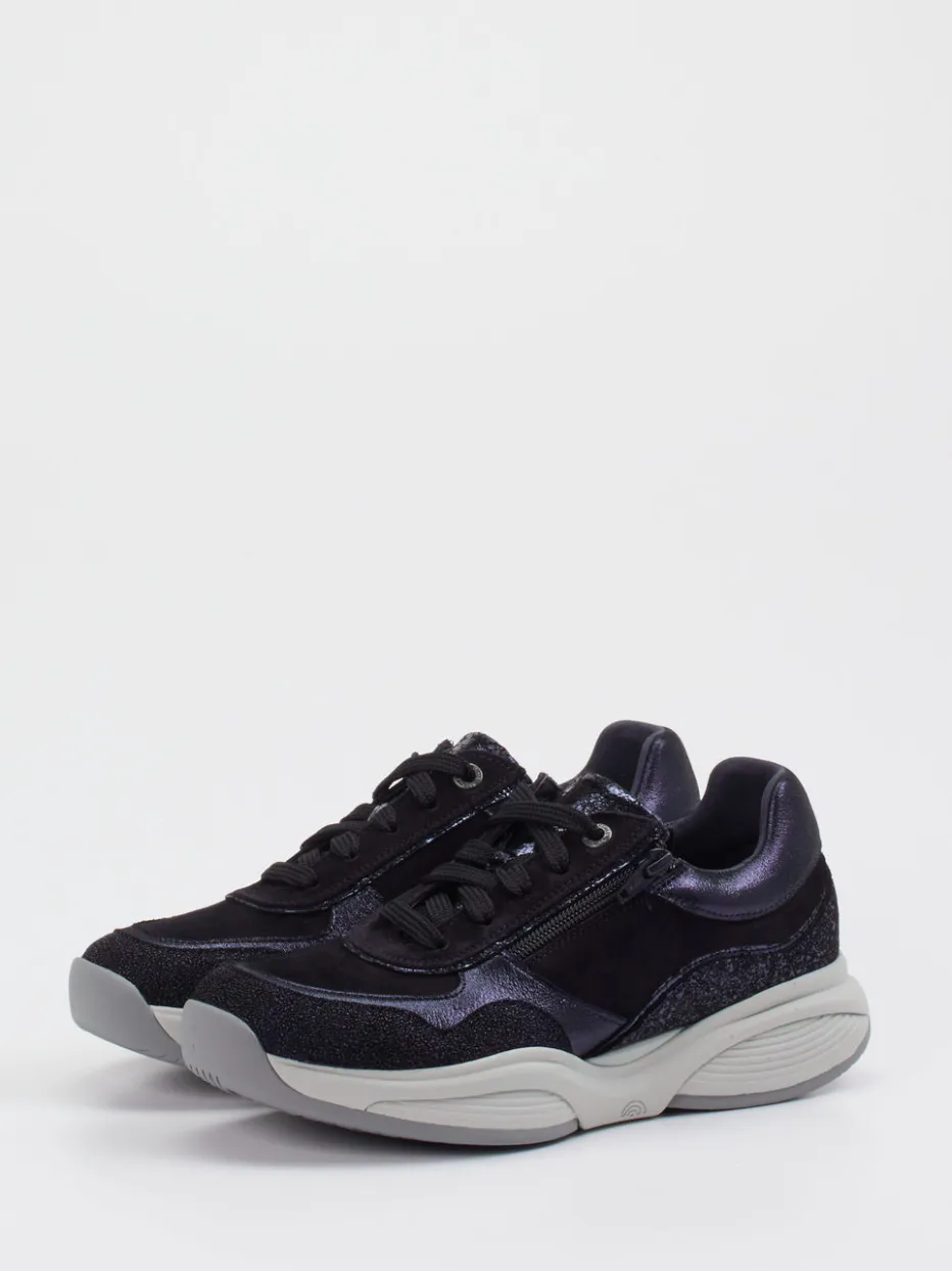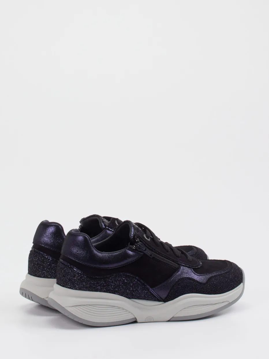 Komfort trifft glänzende Details.Der Damen-Sneaker von XSensible vereint Bequemlichkeit mit modischem Flair. Ideal für entspannte Alltagsmomente bietet dieser Komfort-Sneaker dank Stretchwalker-Sohle hervorragende Unterstützung. Veloursleder bildet die Basis und wird durch irisierende Metallic-Akzente und Glitter-Details effektvoll ergänzt. Die voluminöse Silhouette wird durch eine praktische Kombination aus Schnürung und seitlichem Reißverschluss ergänzt. Die primär schwarze Optik erhält durch Violett- und Hellgraunuancen dynamische Tiefe – perfekt abgestimmt auf den aktuellen Chunky-Sneaker-Trend mit Streetwear-Appeal. Lässt sich mühelos zu Casual-Styles und urbanen Freizeitlooks kombinieren. Ein Modell von XSensible mit klarer Komfort-DNA und modischer Spannung.