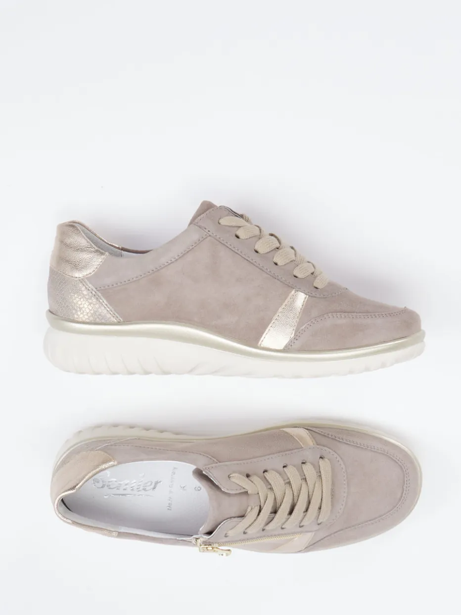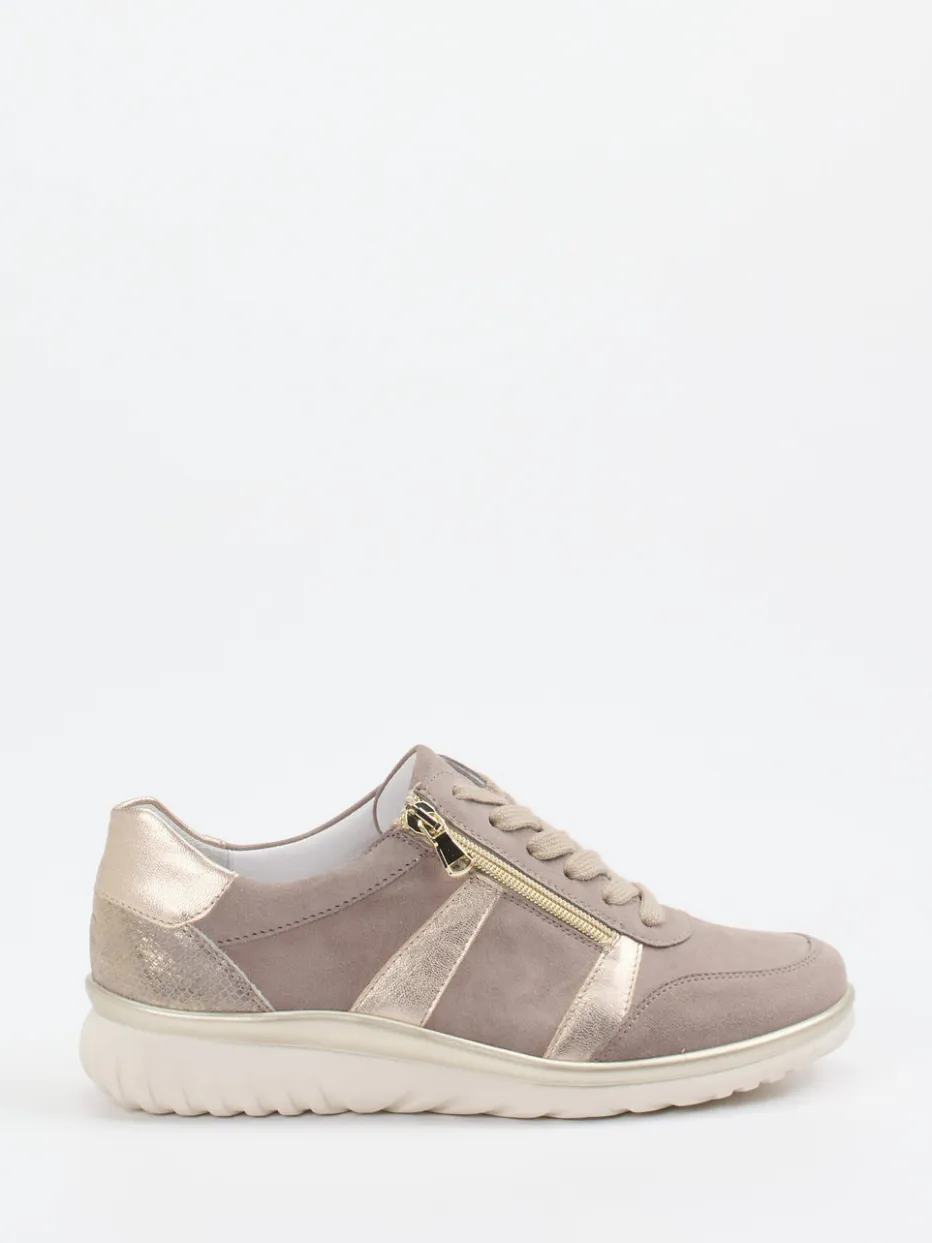 Facettenreicher Komfort für entspannte Tage.Der Komfort-Sneaker von Semler überzeugt als hochwertiger Alltagsbegleiter. Seine rund ergonomische Form in Weite K richtet sich an komfortorientierte Trägerinnen. Das taupefarbene Veloursleder wird durch champagnerfarbene Metallic-Applikationen an Ferse und Außenseite akzentuiert, während der seitliche Reißverschluss in Goldoptik das Anziehen erleichtert. Eine weich gepolsterte PU-Sohle mit Flex-Kerben sorgt für angenehmes Laufgefühl, das herausnehmbare Fußbett steigert den Wohlfühlfaktor. Der Look passt zum minimalistischen Athleisure-Stil und wirkt besonders edel zu Stretch-Jeans. Semler steht für bequeme Passformen, hochwertige Verarbeitung und modische Leichtigkeit.