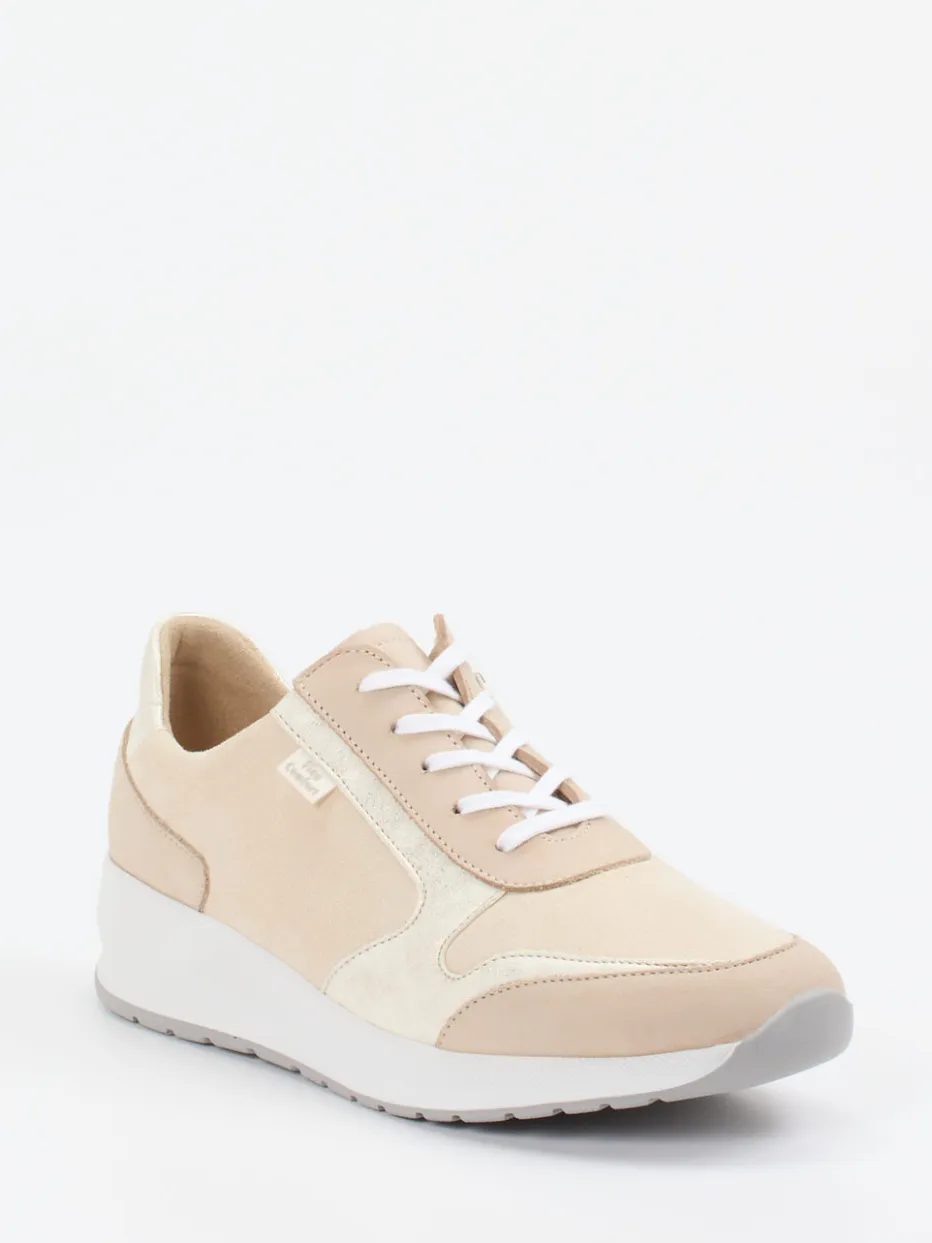 Wohlgefühl mit subtilem Glanz.Finn Comfort präsentiert einen Komfort-Sneaker für Damen mit stilvoll-minimalistischem Anspruch. Ein Allrounder für entspannte Alltagsmomente: Das Modell kombiniert beiges, samtig angeschliffenes Veloursleder mit strukturiertem Textil und partiell glänzendem Glattleder in Metallic-Optik. Die sportlich-abgerundete Silhouette betont den cleanen Look, ergänzt durch Ton-in-Ton-Nähte und einen seitlichen Reißverschluss für bequemes Anziehen. Die flexible Gummisohle und die herausnehmbare Innensohle bieten angenehmen Laufkomfort – auch für orthopädische Einlagen geeignet. Dank des zurückhaltenden Farbtons passt der Schuh besonders gut zum Soft-Neutrals-Trend Frühjahr/Sommer 2024. Ein hochwertiger Begleiter mit Fokus auf Komfort, Design und leiser Eleganz.