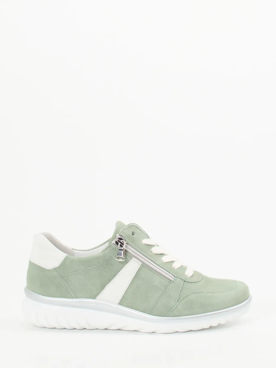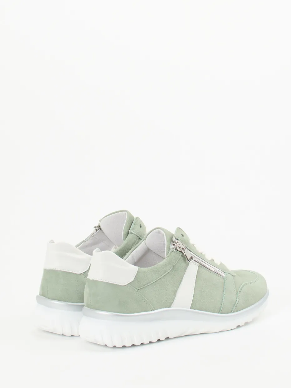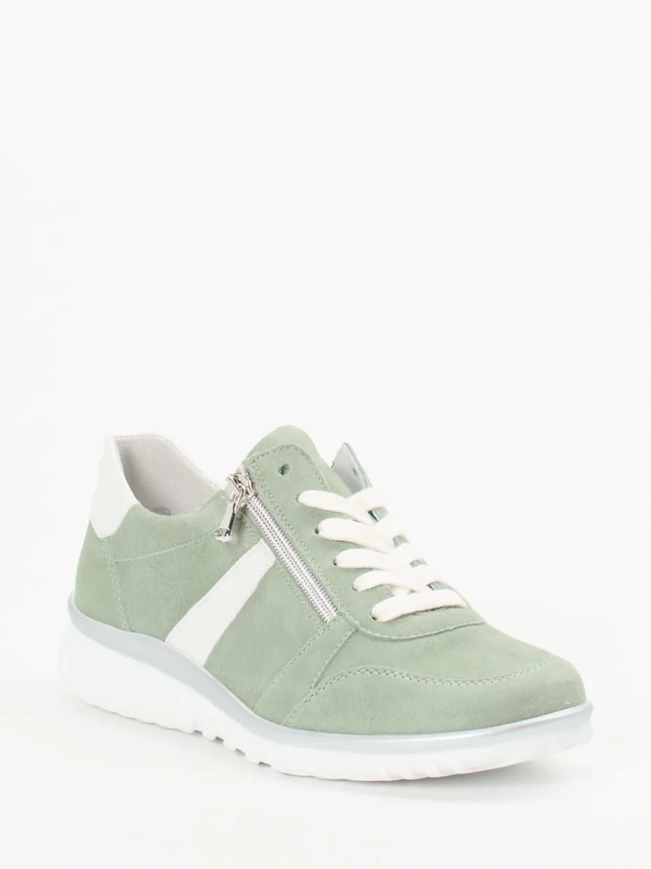 Semler präsentiert einen Damen-Komfort-Sneaker aus anschmiegsamem Veloursleder in trendigem Salbeigrün. Ergänzt durch silberfarbene Akzente und weißen Kontrastbesatz wirkt das Modell frisch und stilbewusst zugleich.