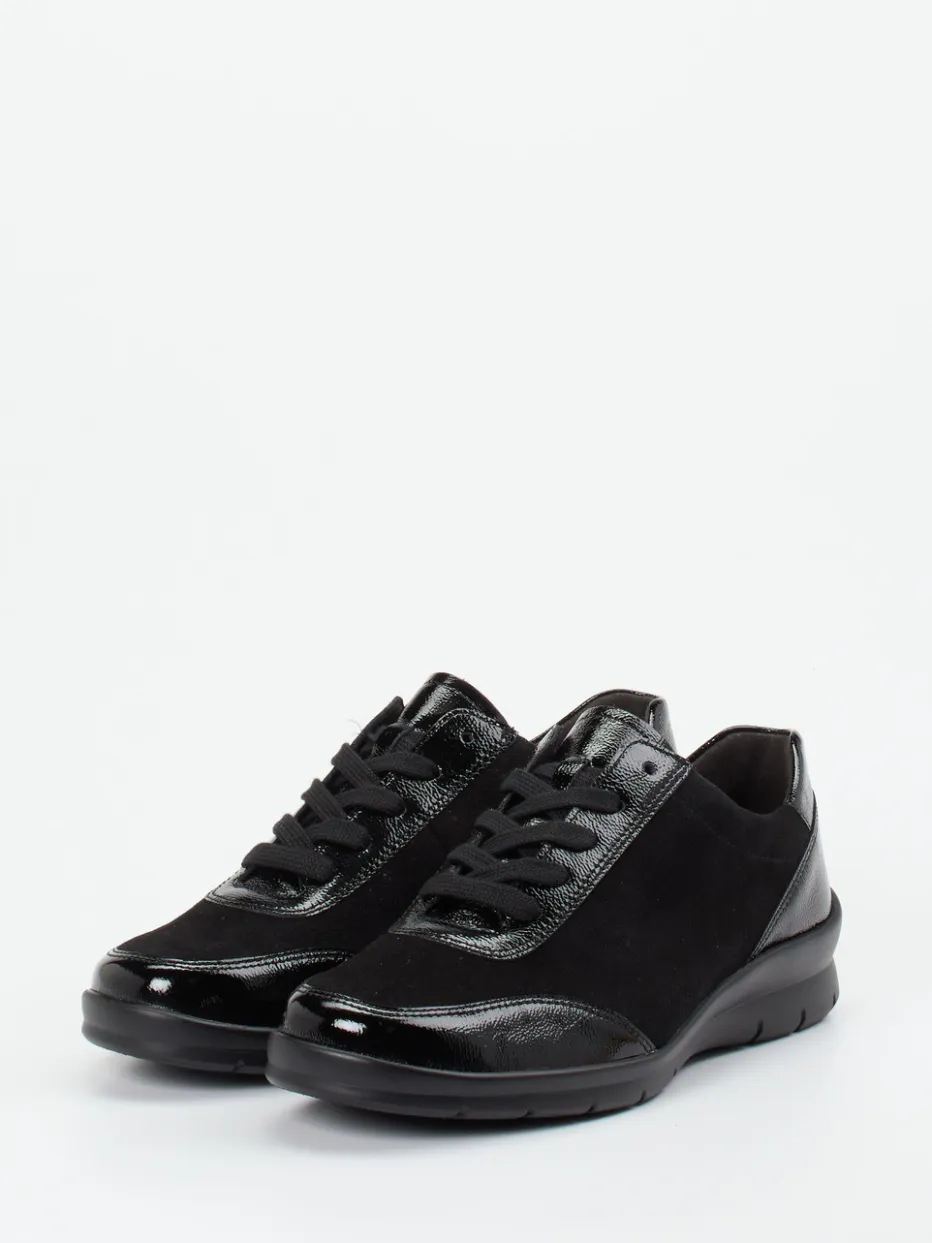 Elegant in Bewegung.Semler präsentiert mit diesem Komfort-Sneaker ein Modell, das Design und Funktion vereint. Ob im Büro oder auf urbanen Wegen – der schwarze Sneaker überzeugt durch hochwertiges Veloursleder, kombiniert mit glänzenden Lackleder-Akzenten an Ferse, Zehenkappe und Schnürleiste. Die abgerundete Form und der weich gepolsterte Schaftrand sorgen ebenso für Tragekomfort wie die profilierte PU-Sohle in Kombination mit der großzügigen Weite H. Klassisch geschnürt und mit einem wechselbaren Fußbett konzipiert, passt das Modell zur stilbewussten Garderobe. Perfekt kombinierbar mit monochromen Looks oder gedeckten Farbakzenten. Semler steht für spürbare Qualität mit komfortablem Anspruch.