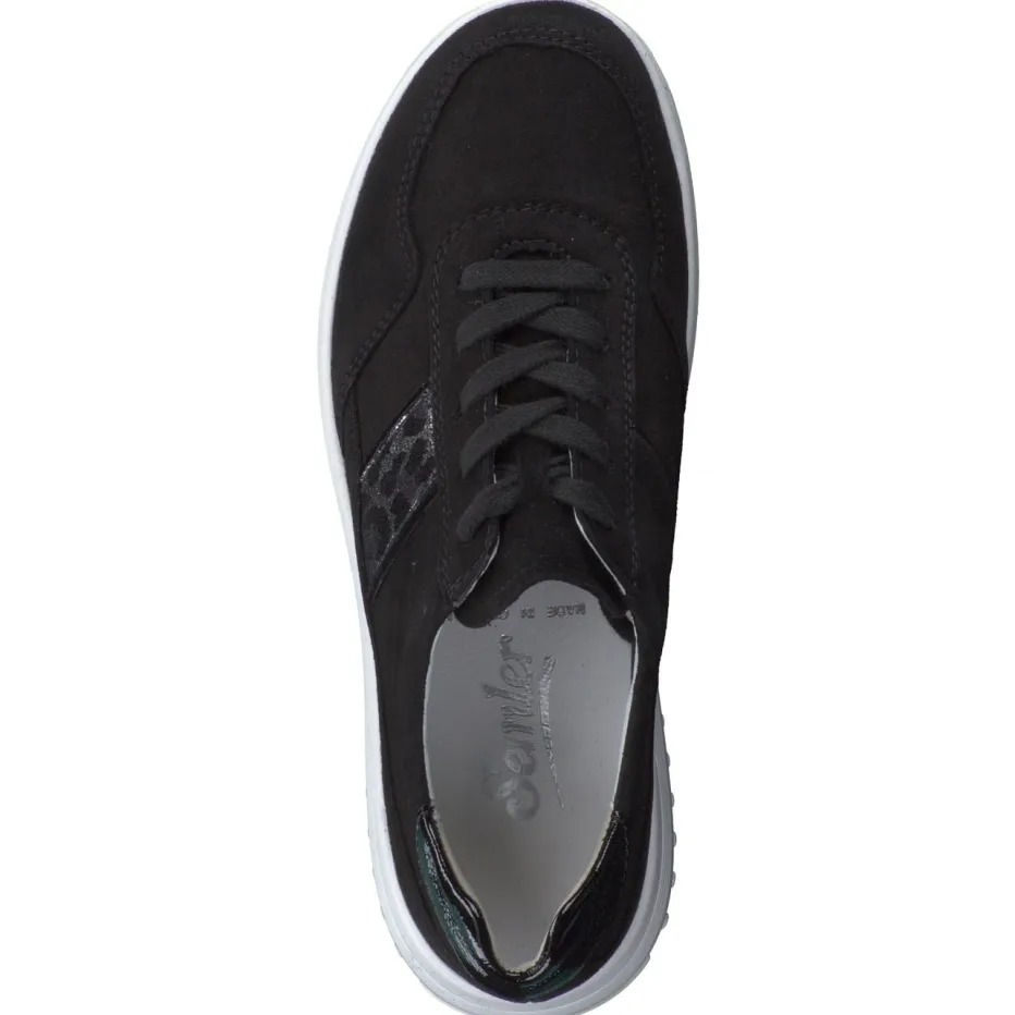 Bequem trifft auf Glanzmomente.Semler präsentiert mit diesem Komfort-Sneaker ein Modell für Damen, das stilvolles Understatement mit optimalem Tragekomfort vereint. Die stoßdämpfende PU-Sohle mit Luftpolster sorgt für ein gelenkschonendes Gehen, ideal für entspannte Spaziergänge oder lange Tage im Alltag. Schwarzes Veloursleder verleiht dem Schuh zusammen mit dem samtigen Finish und mattem Animalprint-Seitendetail eine moderne Ausstrahlung. Besondere Akzente setzen das glänzende Metallicleder an der Ferse und die breite Schnürung. Die klassische, abgerundete Form wird durch eine langlebige Schnürung und ein herausnehmbares Vario-Fußbett ergänzt. Die asymmetrische Gestaltung unterstützt einen dynamischen Streetwear-Look. Semler steht hier für Komfortkompetenz mit modischem Feinsinn.