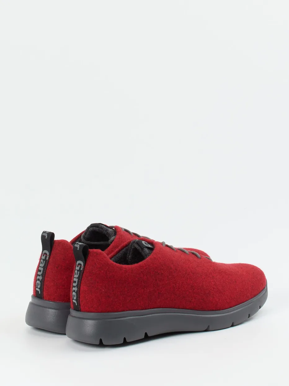 Leichtfüßiger Komfort trifft minimalistisches Design.Ganter präsentiert mit diesem Komfort-Sneaker ein unisex Modell aus reiner Wolle – ideal für bewusstes Tragen im Alltag oder daheim. Das warme Wollmaterial wirkt naturbelassen und sorgt zusammen mit dem ergonomischen Aufbau für spürbaren Tragekomfort. Dunkelrot dominiert den Look, ergänzt durch graue Akzente auf Sohle und Schnürung. Tonale Elemente, eine dezente Zuglasche mit Logo und die abgerundete Silhouette unterstreichen den lässig-ruhigen Stil. Die extraleichte Gummisohle mit rutschhemmendem Profil erhöht die Alltagstauglichkeit. Optional bietet das wechselbare Korkfußbett Platz für eigene Einlagen. Ein durchdachtes Wohlfühlmodell im Zeichen von Quiet Luxury und nachhaltiger Materialwahl.