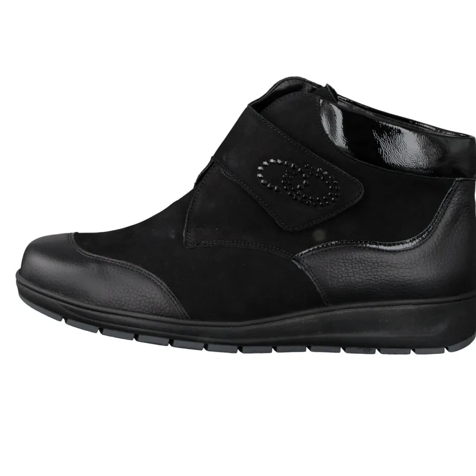 Diese bequeme Damen-Stiefelette bietet mit gepolsterter Sohle, Klettverschluss und glänzenden Zierdetails eine gelungene Verbindung aus Tragekomfort und femininer Klarheit.