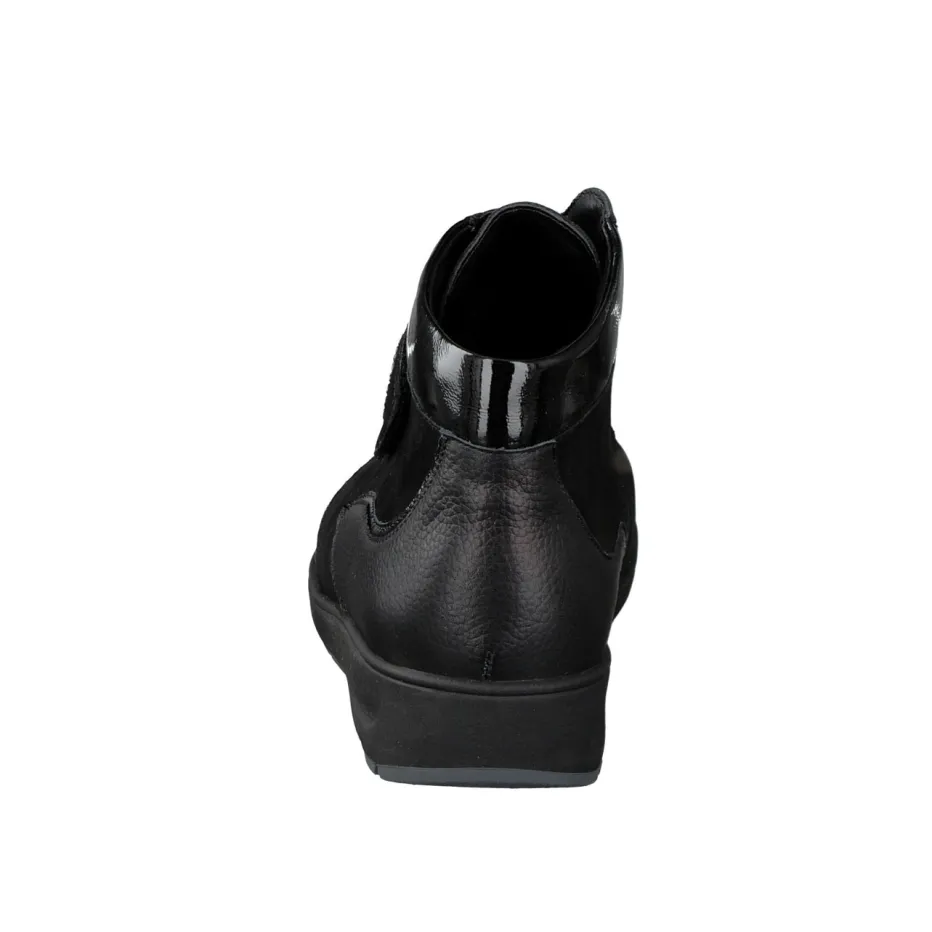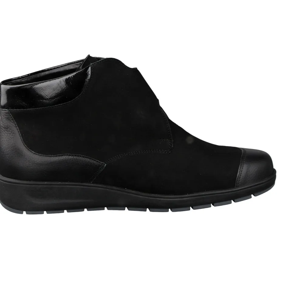Für entspanntes Gehen im Alltag.Die Marke Waldläufer präsentiert eine komfortable Damen-Stiefelette in klassischem Schwarz. Ideal für lange Tage und kalte Jahreszeiten verbindet dieses Modell weiches Nubukleder mit Einsätzen aus glattem Kalbleder. Der glänzende Lackabschluss an der Ferse sowie eine femininen Zierapplikation mit Strasssteinen setzen dezente Designakzente. Die knöchelhohe Form mit breitem Klettverschluss lässt sich individuell anpassen. Innen sorgt eine warme Textilfütterung für Wohlgefühl, das gepolsterte und herausnehmbare Fußbett unterstützt den Einsatz eigener Einlagen. Die rutschhemmende Luftpolstersohle bietet sicheren Halt auf glatten Untergründen – ein Treffer für alle Quiet-Luxury-Enthusiastinnen. Verlässlicher Komfort trifft eleganten Minimalismus – typisch Waldläufer.