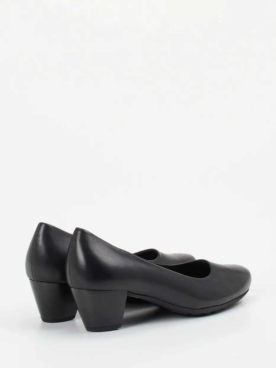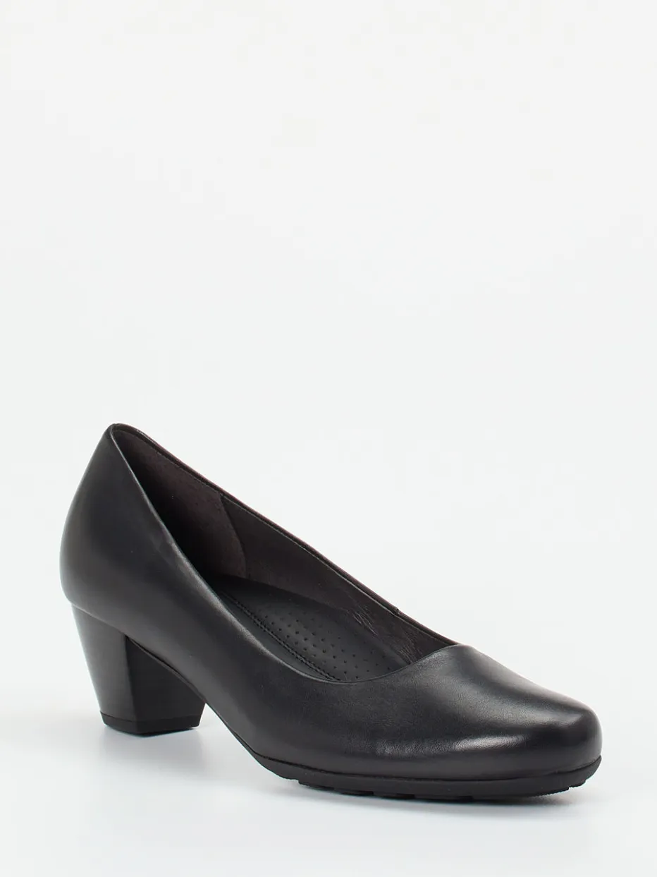Stilvoll durch den Alltag.Gabor Comfort präsentiert elegante Komfortpumps für Damen mit klarer Formsprache. Für stilsichere Auftritte im Büro oder bei urbanen Erledigungen bietet dieser Pumps aus schwarzem Kalbleder mit sanftem Glanz eine überzeugende Kombination aus Eleganz und Komfort. Die weich gepolsterte Decksohle mit ergonomischer Formung unterstützt ermüdungsfreies Gehen, während der strukturierte Blockabsatz festen Stand verleiht. In klassisch gerundeter Silhouette und matt wirkender Oberfläche trifft dezente Ton-in-Ton-Naht auf eine rutschhemmende Gummisohle. Quiet Luxury und Comfort Core finden hier eine gelungene Verbindung – ideal für klassisch-komfortbewusste Looks. Harmoniert perfekt mit Blazer und Lederhandtasche. Komforttechnologie von Gabor trifft auf zurückhaltenden Stil mit Substanz.