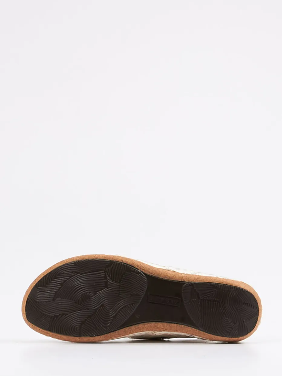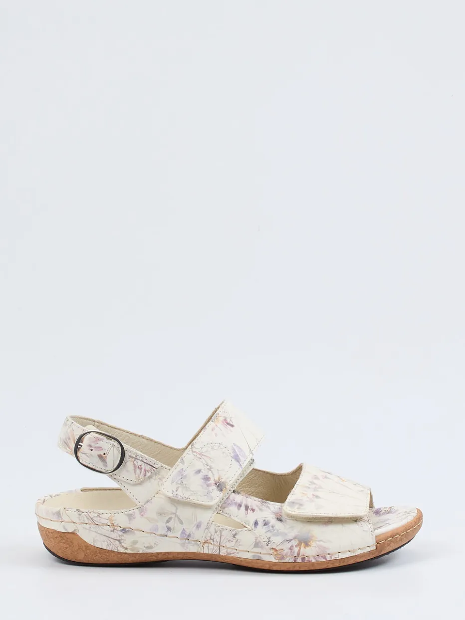 Blütenakzente mit Komfortwirkung.Waldläufer interpretiert mit dieser Komfortsandale ein sommerliches Must-have für entspannte Tage. Die Sandale überzeugt mit ergonomisch gepolstertem Fußbett, weich glänzendem, floral geprägtem Leder in zartem Creme und Lavendel sowie einem rutschhemmenden Kork-Keilabsatz. Zwei Klettverschlüsse und ein silberfarbener Schnallenriemen ermöglichen individuelle Anpassung, während das Lederfutter und die Weite H für spürbaren Tragekomfort sorgen. Der Botanical-Print setzt den Soft-Wellness-Trend geschmackvoll um und wirkt ideal in Kombination mit fließenden Stoffen. Stil und Wohlgefühl in einem – typisch Waldläufer.