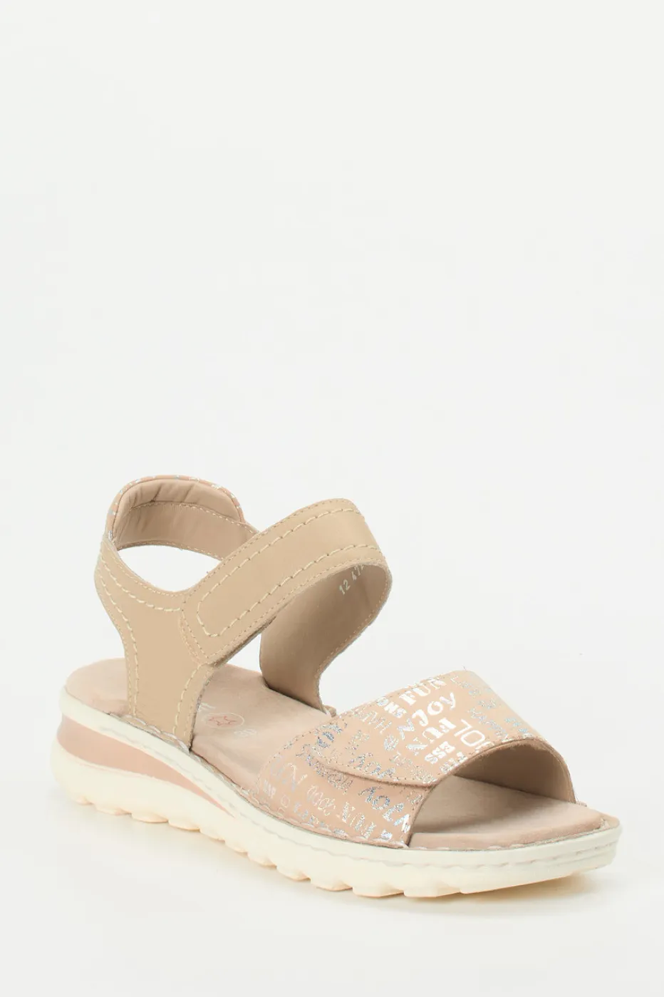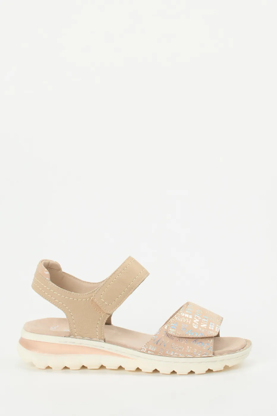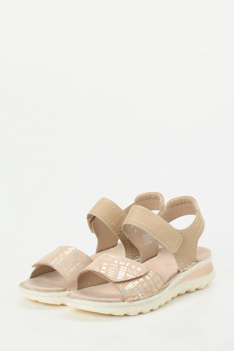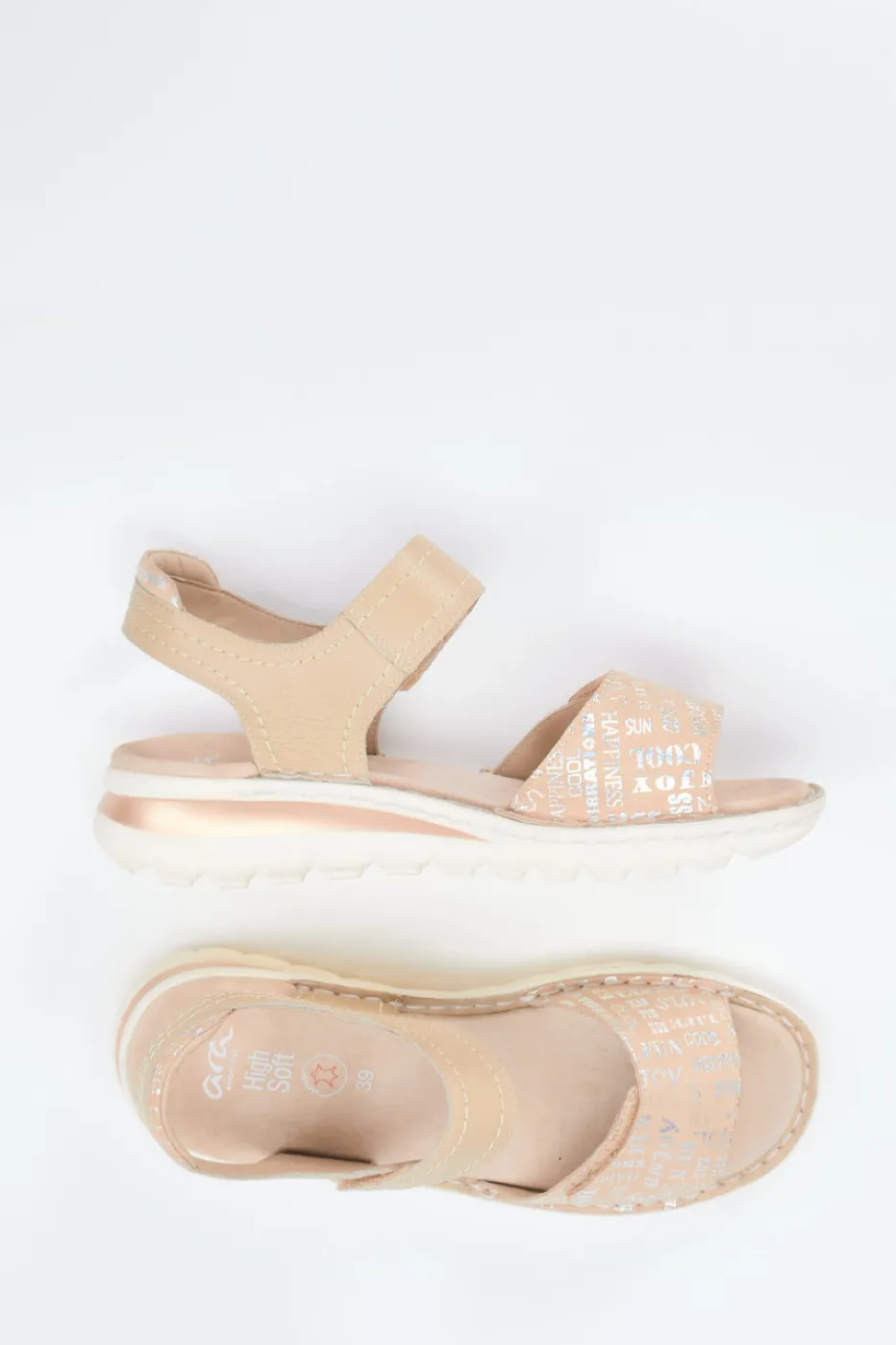 Sommerschuh mit Stilgefühl.Ara präsentiert mit dieser Komfortsandale in Weite G ein Modell für Alltag und Urlaub. Dank des geprägten Leders mit genarbter Struktur wirkt die beige Oberfläche wertig und modern. Breite Riemen mit subtilem Schriftzug-Print und ein verstellbarer Klettverschluss bieten sicheren Halt. Ein High-Soft-Fußbett sorgt für weiches Auftreten, während die weiße PU-Sohle mit Keilansatz und roségoldenem Kontrastrand Stabilität und modische Raffinesse vereint. Akzente wie Kontrastnähte und die profilierte Laufsohle unterstützen den Casual-Look. Ideal zu Leinenhosen oder luftigen Tuniken kombinierbar. Markentypischer Komfort für anspruchsvolle, stilbewusste Sommertage.
