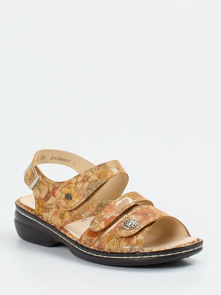 Für entspannte Sommertage mit Stil.Finn Comfort präsentiert eine Damen-Komfortsandale, die Funktionalität mit ansprechender Optik verbindet. Ideal für Alltag oder Zuhause bietet das Modell Gomera dank anatomischem, lederbezogenem Kork-Wechselfußbett und ergonomischer Passform höchsten Tragekomfort. Das geprägte Leder zeigt sich in einem warmen Beige mit schimmernden, floralen Metallic-Elementen – ein edles Finish mit Retro-Charme. Drei stufenlos verstellbare Klettverschlüsse und ein zusätzlicher Fersenriemen mit Schnalle garantieren sicheren Halt. Die leichte PU-Sohle mit sanftem Absatz sorgt für Stabilität und unterstützt bequemes Gehen. Kombiniert zu Leinenkleidern oder sommerlichen Hosen entsteht ein stilbewusster Look mit Komfortanspruch. Finn Comfort steht für langlebige Qualität mit orthopädischem Mehrwert.