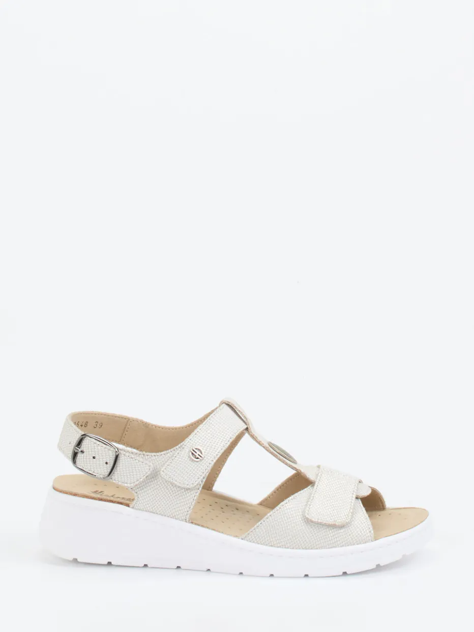 Bequemer Chic für entspannte Sommertage.Die Hickersberger Komfortsandale für Damen verbindet ergonomisches Design mit hochwertigem Tragekomfort. Mit ihrem geprägten Leder in champagnerbeigem Ton, der leicht strukturierten Oberfläche und metallischen Details schafft sie einen modernen Look. Die offene Silhouette wird durch verstellbare Klettverschlüsse und eine silberfarbene Schnalle am Fersenriemen ergänzt, wodurch eine individuelle Passform möglich wird. Eine softe Mikrofaser-Fütterung sowie die bewährte PU-Sohle mit rutschhemmenden Einsätzen sorgen für Alltagstauglichkeit und Trittsicherheit. Ob barfuß im Garten oder kombiniert zur luftigen Leinenhose – dieses Soft-Neutrals-Modell liegt im Trend. Markentypische Komfortdetails runden das ganzheitlich entspannte Tragegefühl stilvoll ab.