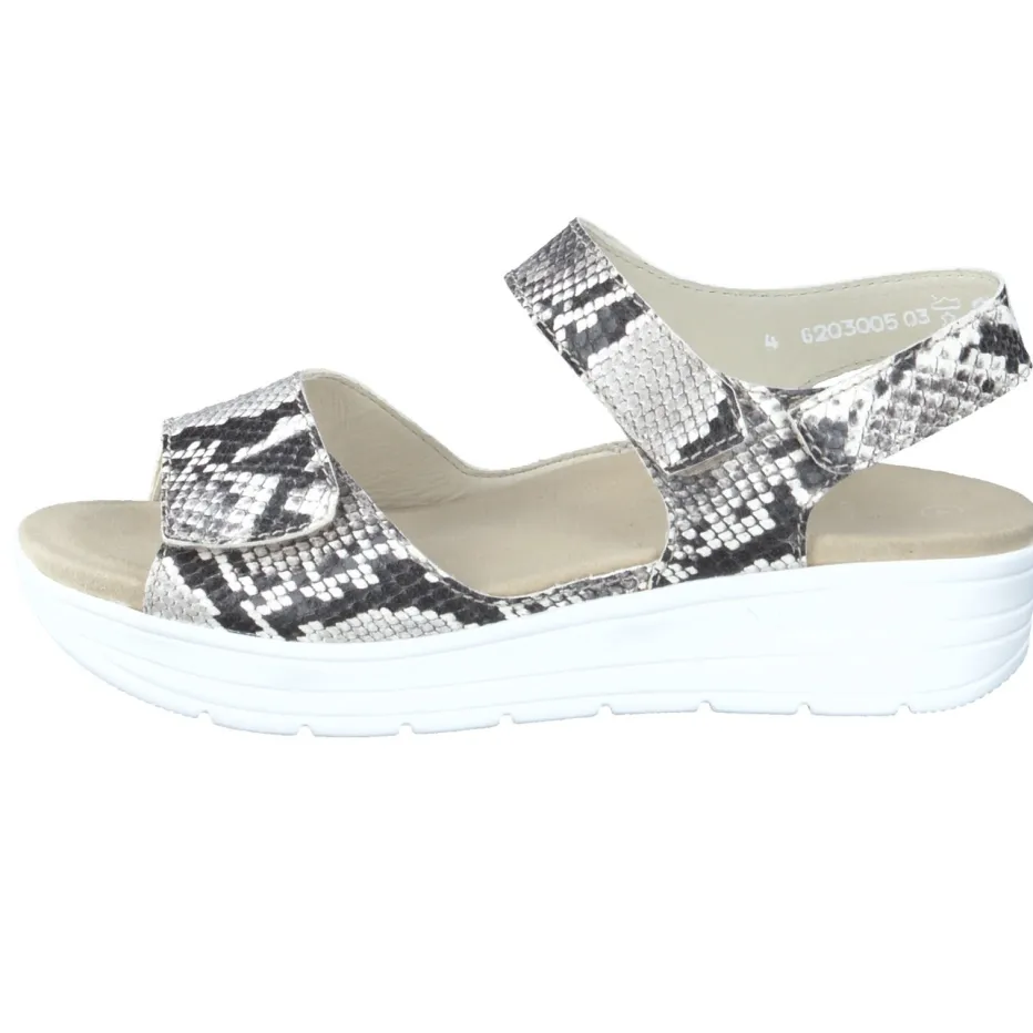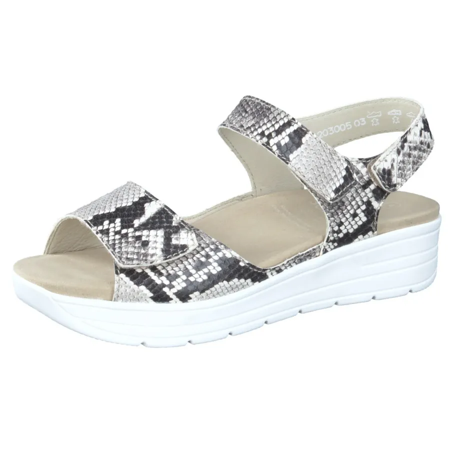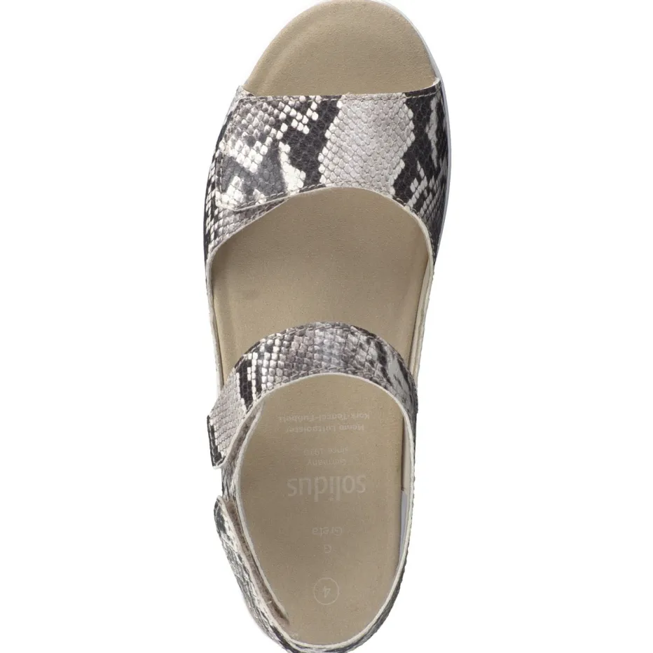 Stilvoll durch den Alltag.Die Marke Solidus präsentiert hier eine komfortorientierte Komfortsandale für Damen. Ideal für entspannte Momente zu Hause oder unterwegs überzeugt die Sandale mit geprägtem Leder in hochwertiger Python-Optik. Der beigegraue Ton wirkt dezent und trendaktuell zugleich, während die breite Riemenstruktur mit zwei Ton-in-Ton-Klettverschlüssen eine passgenaue Weitenregulierung ermöglicht. Die ergonomisch geformte, weiß profilierte PU-Keilsohle bietet Komfort und sicheren Stand. Eine weichgepolsterte, lederbezogene Innensohle unterstützt ganztägiges Tragegefühl und kann gegen Einlagen getauscht werden. Markentypische Qualität und Alltagstauglichkeit im modischen Reptil-Look vereint.