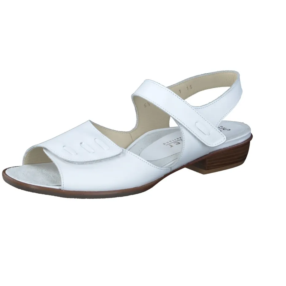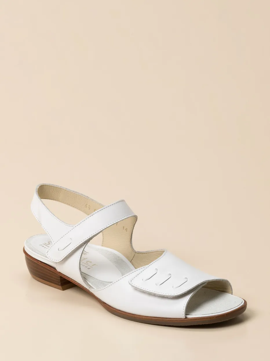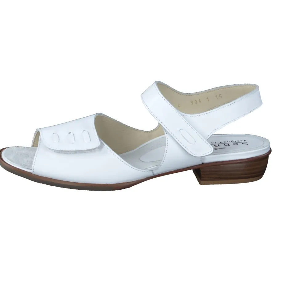 Eleganz trifft Alltagstauglichkeit.Die Marke Schneider bietet mit dieser weißen Komfortsandale ein Modell, das feminine Leichtigkeit und Bequemlichkeit vereint. Perfekt für lange Sommertage, überzeugt die Sandale durch geschmeidiges Kalbleder mit matter Oberfläche und eine ergonomisch geformte Silhouette. Zwei Klettverschlüsse ermöglichen eine individuelle Passform. Die gepolsterte Innensohle aus Veloursleder sorgt für weichen Auftritt, während die stabile Gummi-Laufsohle mit Lederanteil Trittsicherheit bietet. Farblich abgestimmte Nähte und ein Blockabsatz in Holzoptik unterstreichen den unaufdringlichen Stil. Minimalistische Details und hochwertige Verarbeitung greifen den „Quiet Luxury“-Trend gekonnt auf. Harmoniert mit hellen Leinen-Looks oder sommerlicher Eleganz. Ein durchdachtes Design für kompromisslosen Komfort mit klassischem Anspruch.