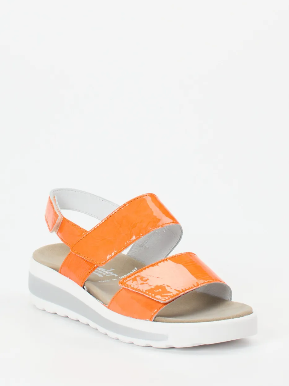 Die offene, ergonomische Form mit gepolstertem Fußbett bietet Komfort bei jedem Schritt. Gefertigt aus glänzendem Lackleder, ergänzt durch weiches Lederfutter, überzeugt sie durch ihr kraftvolles Orange im Color-Blocking-Stil. Breite, tonige Klettverschlüsse sorgen für optimale Anpassung, die leichte PU-Sohle mit 2,5 cm Laufhöhe dämpft angenehm. Die Sandale greift den „Functional Footwear“-Trend auf und lässt sich besonders gut mit luftiger Leinenmode kombinieren.