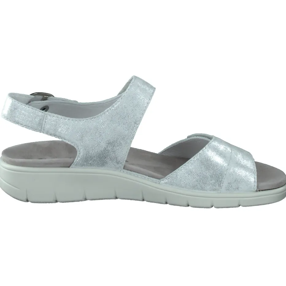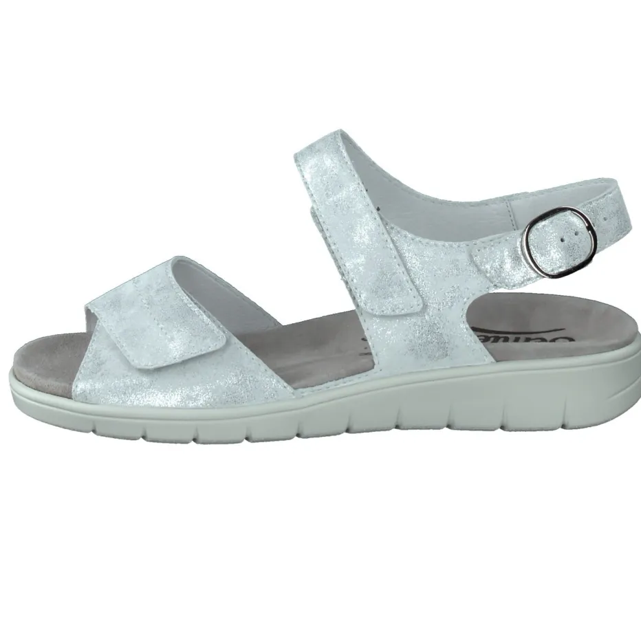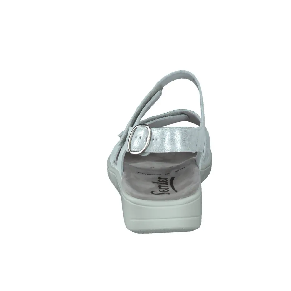 Die Marke Semler präsentiert eine Komfortsandale für Damen, gefertigt aus anschmiegsamem Veloursleder mit Metallic-Finish. Die silberweiße Farbgebung sorgt für einen dezenten Glanz im Look.