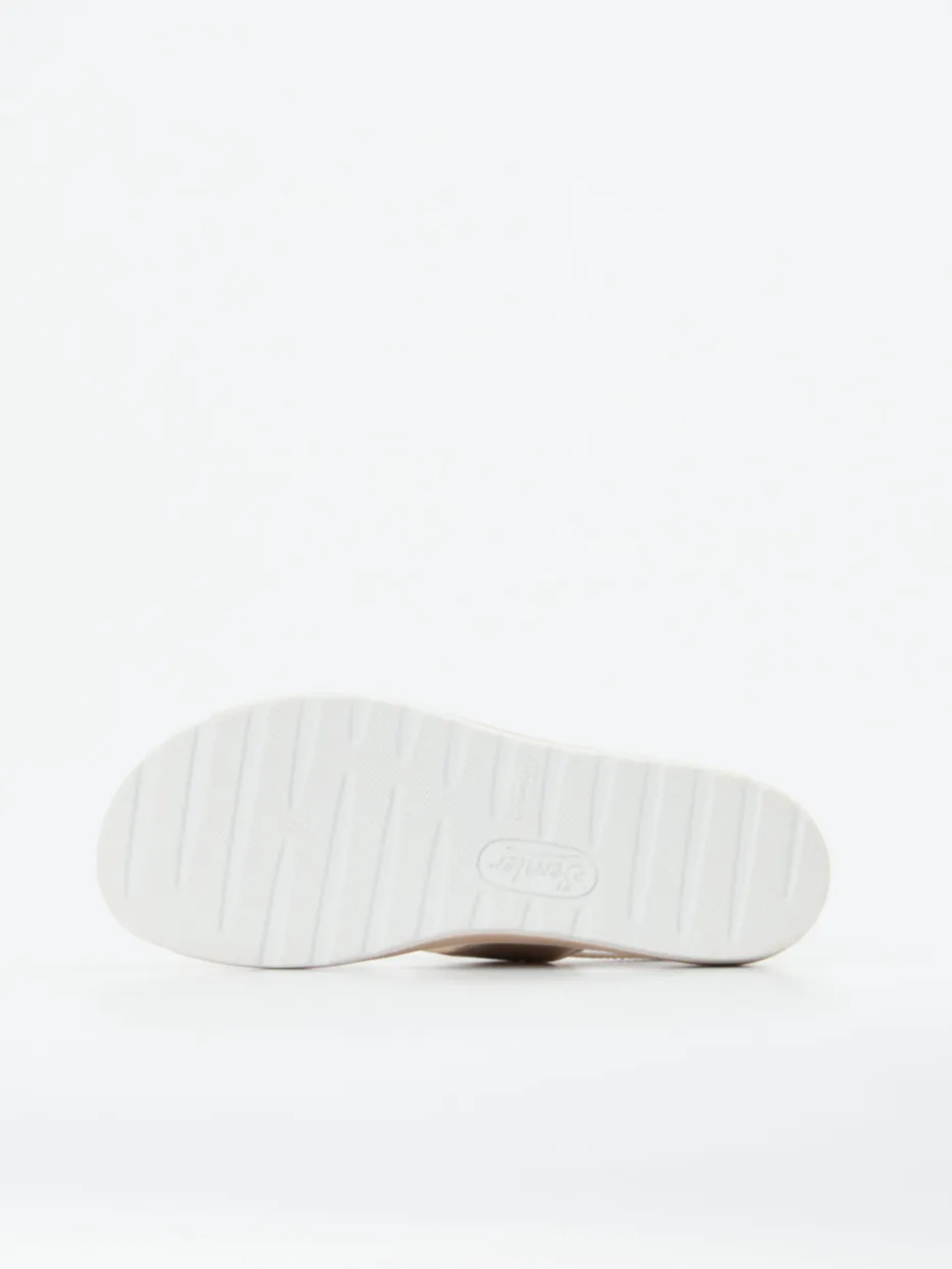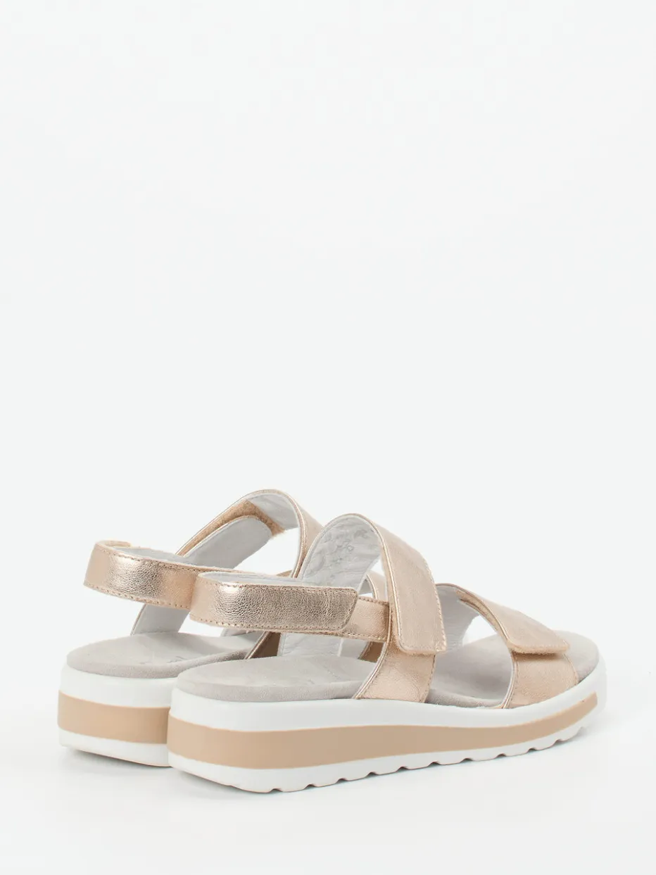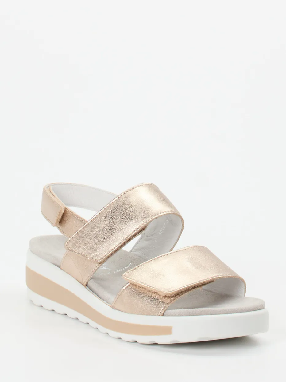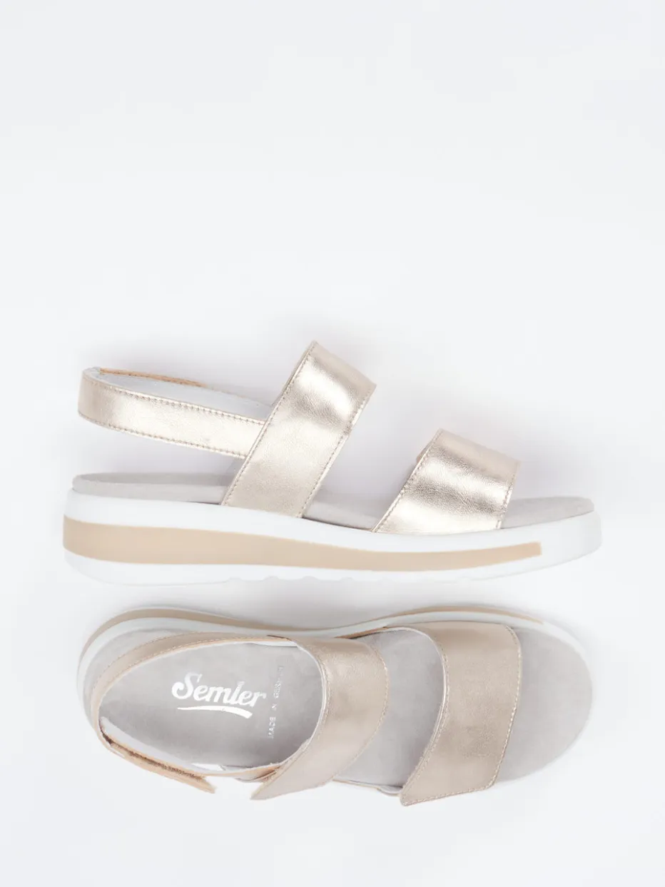 Stilvolle Leichtigkeit für warme Tage.Semler präsentiert eine bequeme Komfortsandale für Damen. Beim entspannten Stadtbummel oder im Urlaub bietet das Modell in edlem Goldton zuverlässigen Komfort. Weiches Metallicleder mit glänzendem Finish sorgt für ein elegantes Erscheinungsbild, während das herausnehmbare, gepolsterte Fußbett ergonomische Unterstützung liefert. Der praktische Klettverschluss erlaubt individuelle Anpassung. Eine dezente, farblich abgesetzte PU-Sohle mit leichter Profilierung ergänzt das offene, sommerliche Design. Minimalistische Formgebung trifft somit auf aktuellen Metallic-Trend. Semler verbindet hochwertige Materialien und Fußkomfort auf anspruchsvolle Weise.