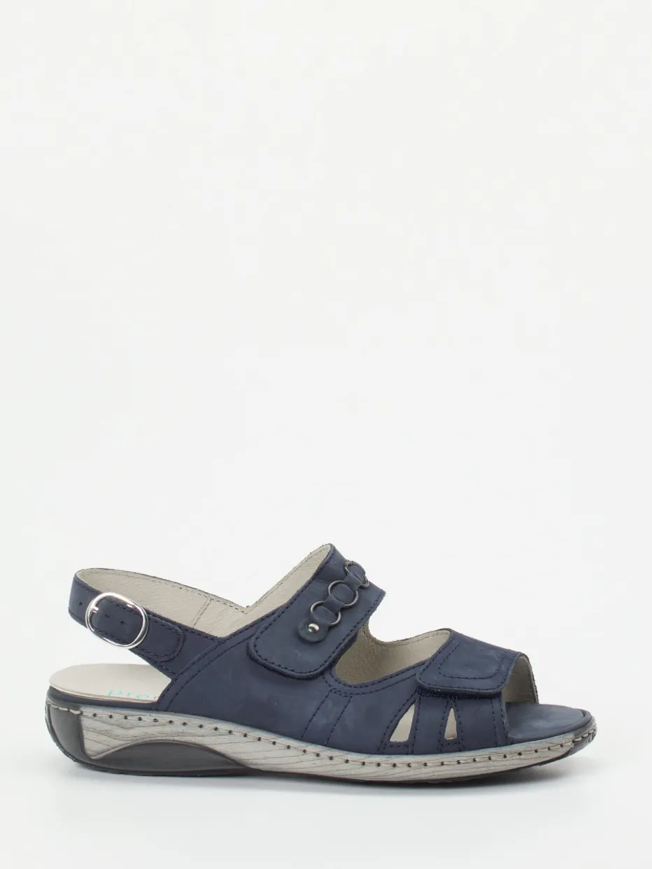 Bequemer Auftritt mit stilvollen Details.Waldläufer präsentiert mit dieser Komfortsandale eine damenfreundliche Lösung für Alltag und Freizeit. Ob beim Stadtbummel oder zuhause – das dunkelblaue Nubukleder ist samtig angeschliffen und passt sich sanft dem Fuß an. Verstellbare Klettverschlüsse und ein zusätzlich regulierbarer Fersenriemen sorgen für individuellen Sitz. Ziernähte und dekorative Metallösen setzen dezente Akzente. Die profilierte Gummisohle in Grautönen bietet sichere Trittdämpfung, das Wechselbett macht die Sandale einlagentauglich. Ideal für Komfortliebhaberinnen mit Sinn für schnörkelloses Design.
