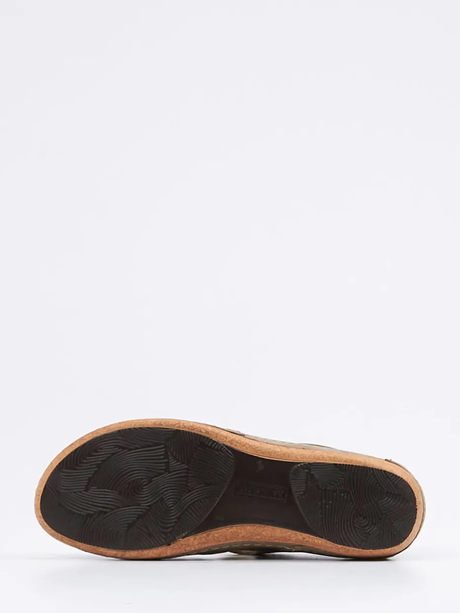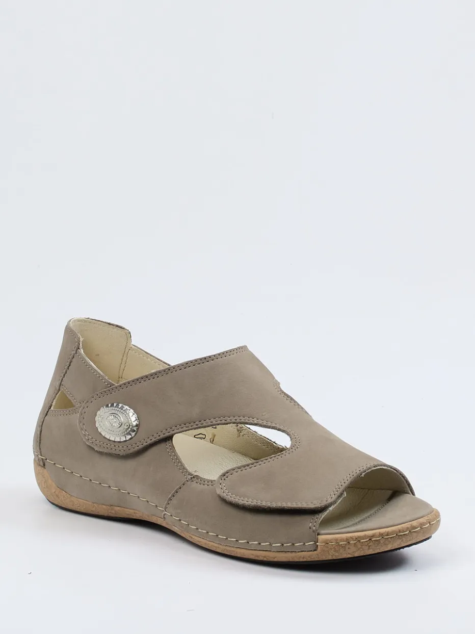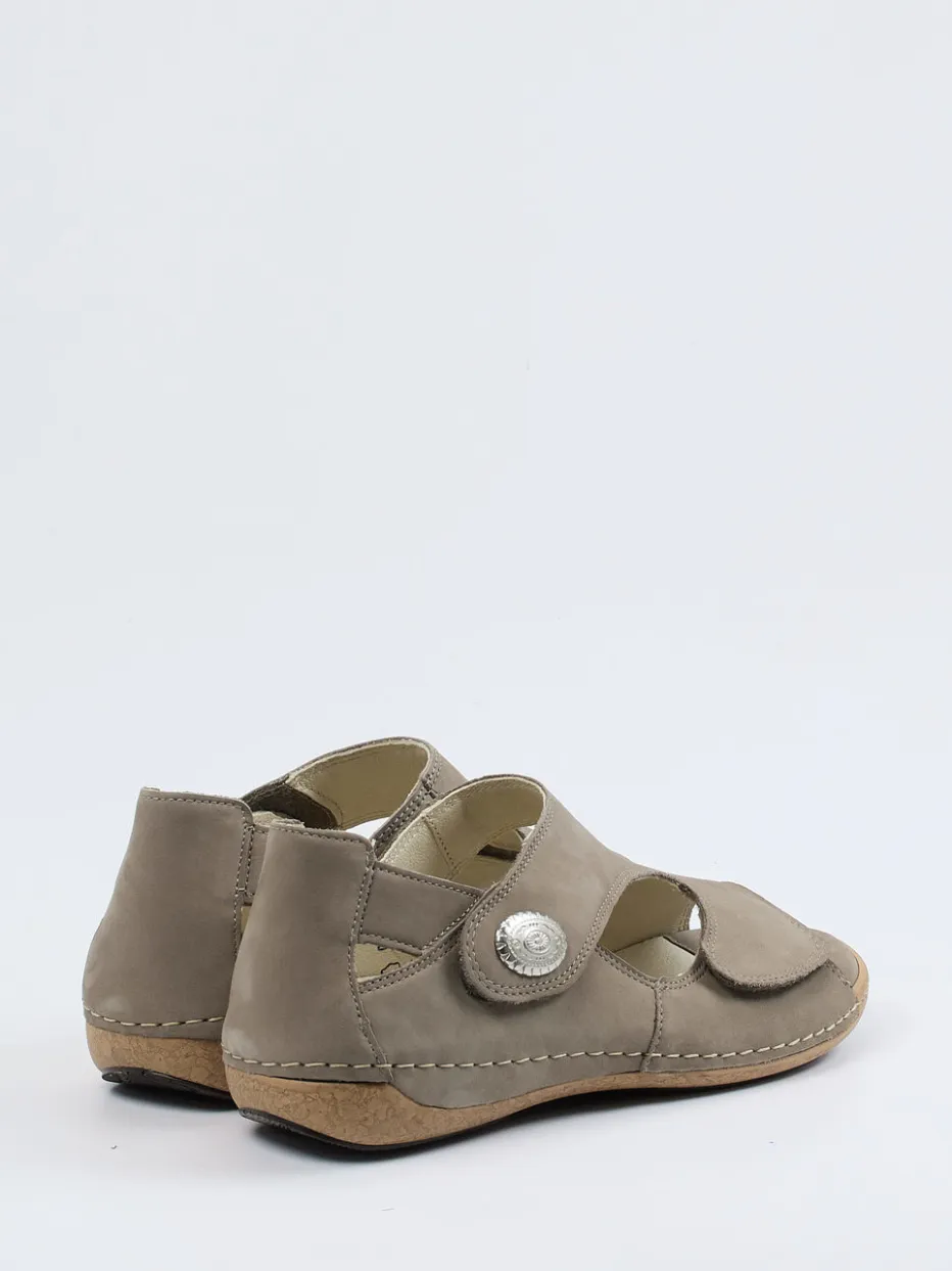 Für entspannte Tage mit Komfortfokus.Die Marke Waldläufer präsentiert mit dieser Komfortsandale ein luftiges Modell für Alltag und Freizeit. Das taupefarbene Nubukleder ist samtig angeschliffen und bietet zusammen mit dem weichen Lederfutter ein besonders angenehmes Tragegefühl. Die Silhouette ist geschlossen gearbeitet, zeigt seitliche Cut-Outs und wird durch einen silberfarbenen Zierknopf und markante Kontrastnähte stilvoll betont. Dank Klettverschluss ist eine schnelle Weiteneinstellung möglich, während die flexible Gummisohle mit Korkrahmung rutschhemmend wirkt. Stilistisch orientiert sich das Modell am „Quiet Comfort“-Trend der Saison und eignet sich ideal für komfortaffine Looks. Waldläufer-typischer Laufkomfort trifft auf zeitlos dezente Optik.