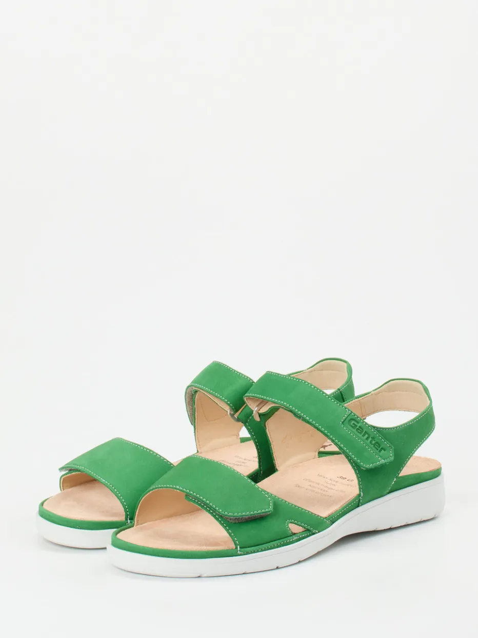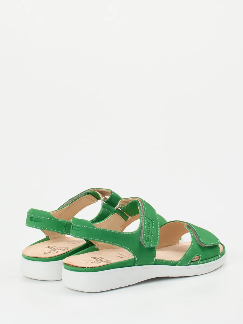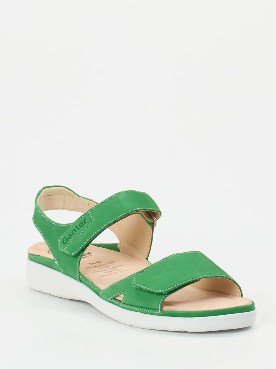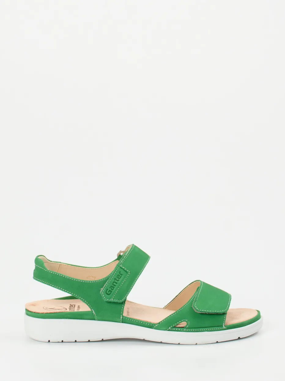 Bequem durch jeden Sommertag.Ganter präsentiert eine komfortorientierte Damen-Kompfortsandale in lebhaftem Grün. Für entspannte Freizeitausflüge oder entspannte Stunden zu Hause bietet diese Sandale eine rundum gelungene Kombination aus Funktion und Wohlgefühl. Gefertigt aus weich angeschliffenem Nubukleder mit tonalen Nähten, ergonomischem Fußbett und gepolsterter Innensohle gewährleistet sie beständige Bequemlichkeit. Die offene, ergonomisch geformte Silhouette mit verstellbaren Klettverschlüssen sorgt für optimale Passform. Die weiße, rutschhemmende Gummisohle sowie die dezente Logo-Prägung unterstreichen das minimalistische Design. Das kräftige Grasgrün interpretiert den Color-Blocking-Trend dezent neu und bleibt alltagstauglich. Ein Begleiter von Ganter für gehobenen Sommerkomfort mit nachhaltigem Qualitätsanspruch.