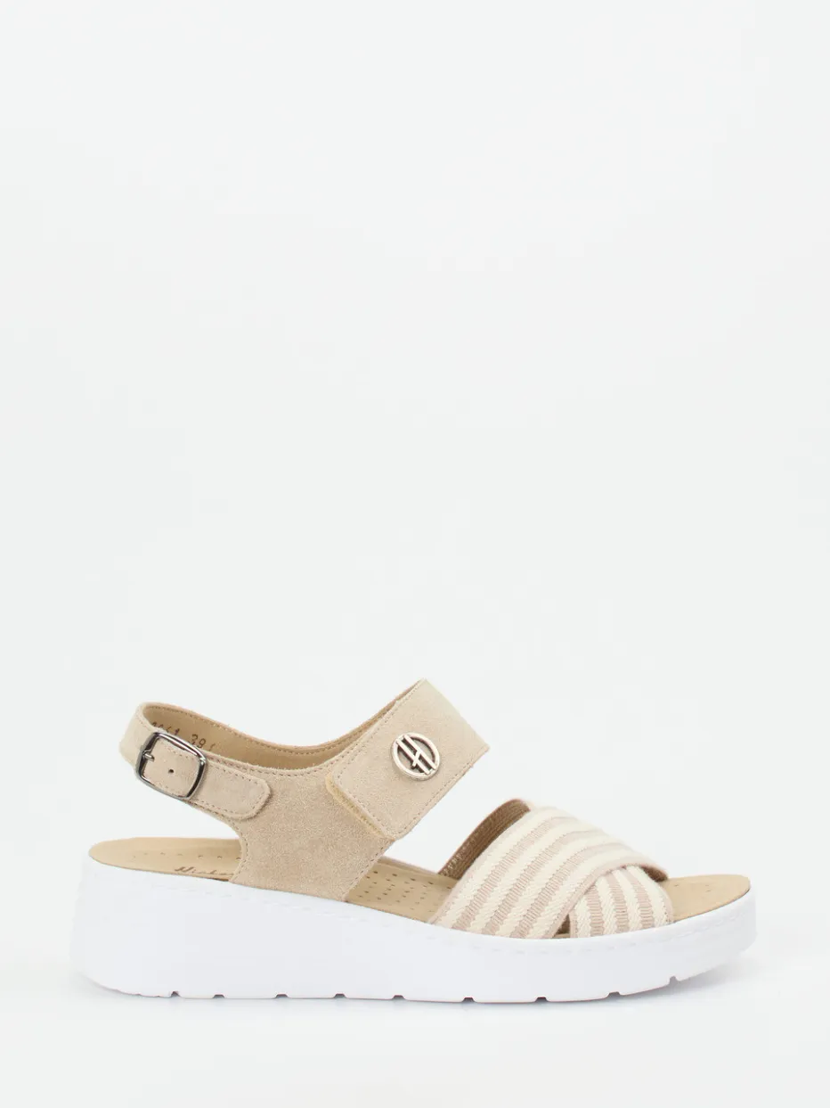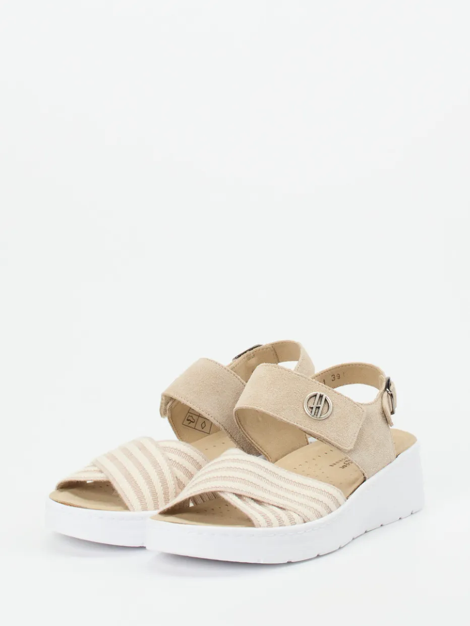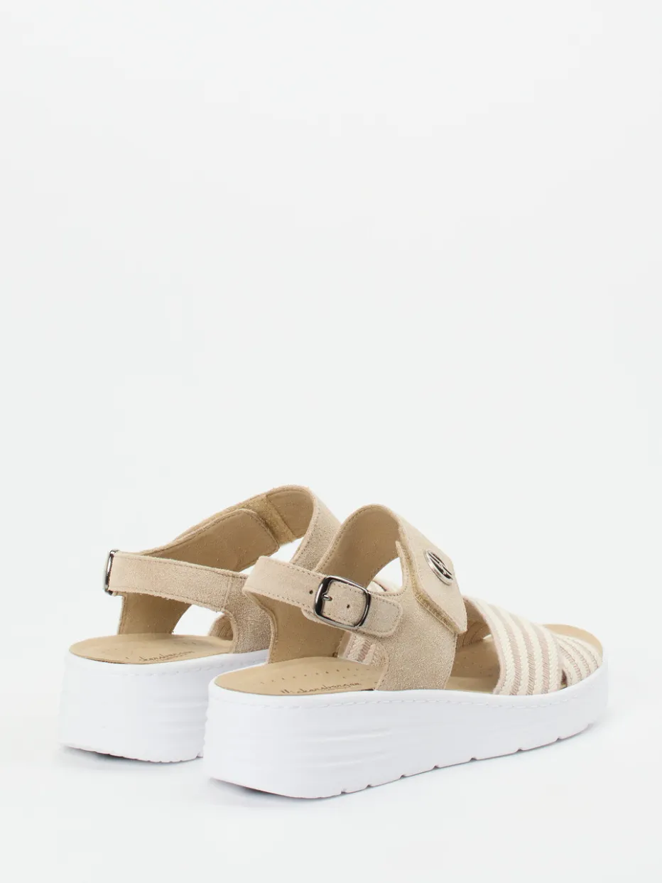 Für entspannte Stunden bei warmem Wetter überzeugt die Komfortsandale durch ihr ergonomisches Design mit weich gepolsterter Innensohle und einer erhöhten PU-Keilsohle. Das beige Textil mit dezentem Streifenmuster wirkt weich und matt, während der verstellbare Fersenriemen durch Schnalle und Klettverschluss individuell angepasst werden kann. Ein metallisches Logo-Emblem und sichtbare Ziernähte ergänzen das minimalistische Design. Der Look passt ideal zu Leinenhosen oder sommerlichen Blusen.