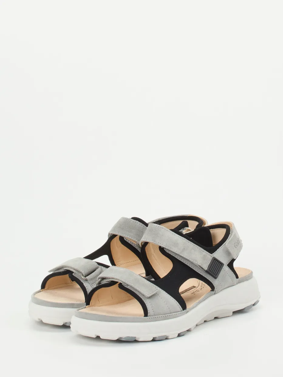 Für aktive Tage bei warmem Wetter. Die Komfortsandale von Ganter wurde für entspannte Alltagsmomente gestaltet. Das Modell Geva kombiniert hochwertiges Veloursleder in Hellgrau mit schwarzem Textil und punktet mit ergonomischem Fußbett sowie einem weichen Lederfutter. Die drei praktischen Klettverschlüsse erlauben eine individuelle Weitenregulierung und garantieren optimalen Halt. Die offene, ergonomische Form und das dezente Design mit tonalen Nähten unterstreichen den funktional-minimalistischen Look. Perfekt für Freizeit und Zuhause, lässt sich diese Sandale besonders gut zu leichten Sommerhosen oder Walking-Socken kombinieren. Ganter steht hier für ausgezeichnete Passform, durchdachte Details und spürbaren Komfort.