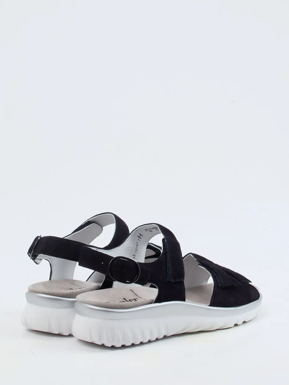 Sommerklar mit Stil und Komfort.Semler präsentiert eine Komfortsandale für Damen, die Alltag und Entspannung vereint. Der weiche Veloursleder-Schuh in edlem Blau überzeugt mit ergonomisch geformter Silhouette und gepolstertem Wechselfußbett. Verstellbare Klettverschlüsse und eine silberfarbene Metallschnalle gewährleisten sicheren Halt, während die keilförmige Gummisohle mit silbernem Rand optische Akzente setzt. Die Kombination aus matter Oberfläche und minimalistischem Design passt ideal zu legeren Looks. Ein Modell für modebewusste Komfortliebhaberinnen – perfekt zu funktionalen Sommerhosen und T-Shirts. Semler steht hier für durchdachte Passform und wohltuende Materialien.
