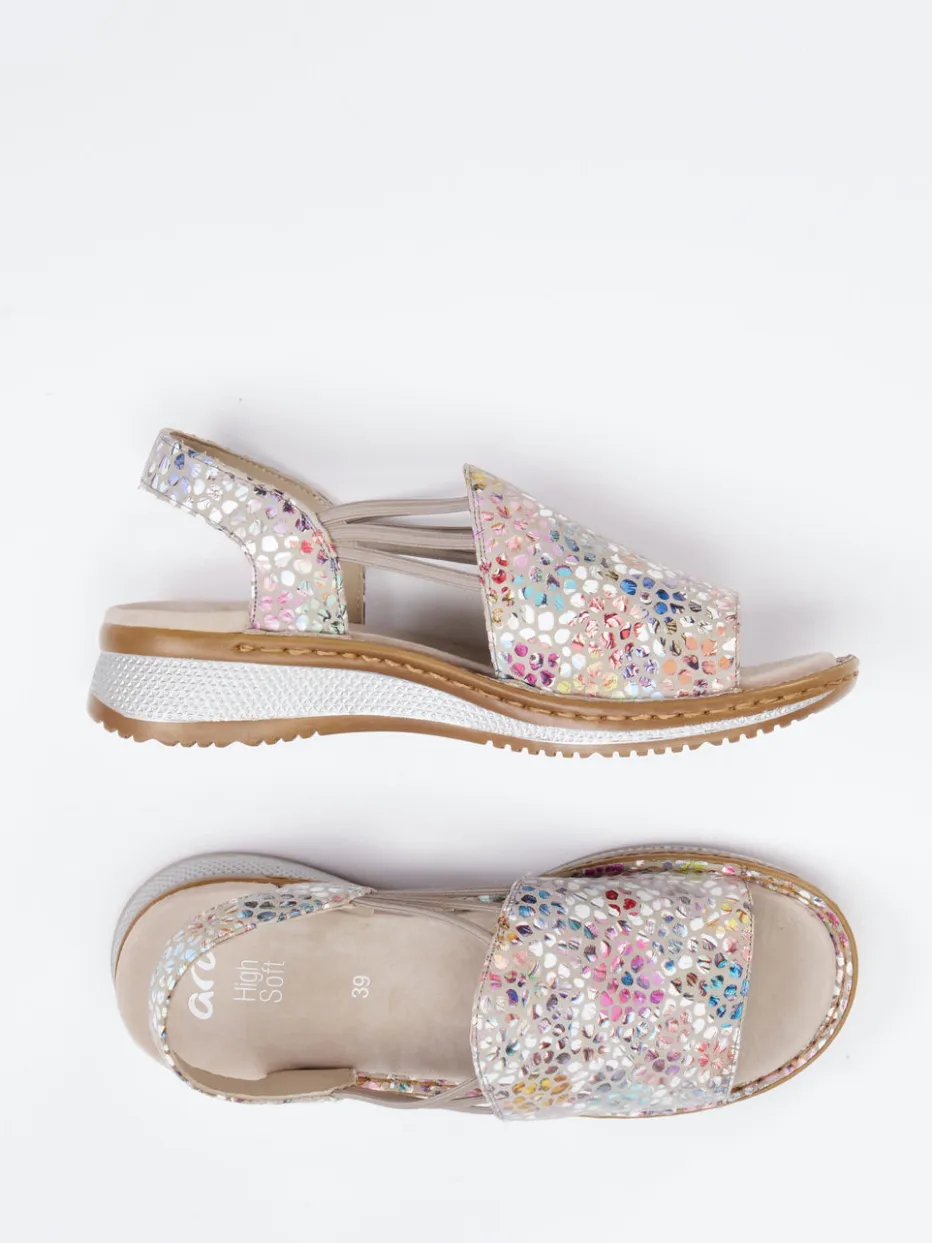 Farbspiel trifft Funktion.Die Marke Ara präsentiert mit dieser Komfortsandale ein Modell für Damen, das sommerliche Leichtigkeit und eleganten Komfort vereint. Ideal für Urlaubstage und entspannte City-Spaziergänge sorgt das geprägte Leder mit schimmerndem Multicolor-Lochmuster für ein feminines Statement. Dank elastischer Textilriemen ist das Anziehen denkbar unkompliziert, während das lederbezogene High-Soft-Fußbett für angenehme Dämpfung sorgt. Die offene Silhouette mit Fersenriemen und die rutschhemmende PU-Sohle unterstützen ein luftiges Tragegefühl bei dezenter Keilhöhe. Ein stilvoller Quiet-Luxury-Look mit modischem Metallic-Finish. Komfort und modischer Ausdruck im charakteristischen Ara-Stil kombiniert.