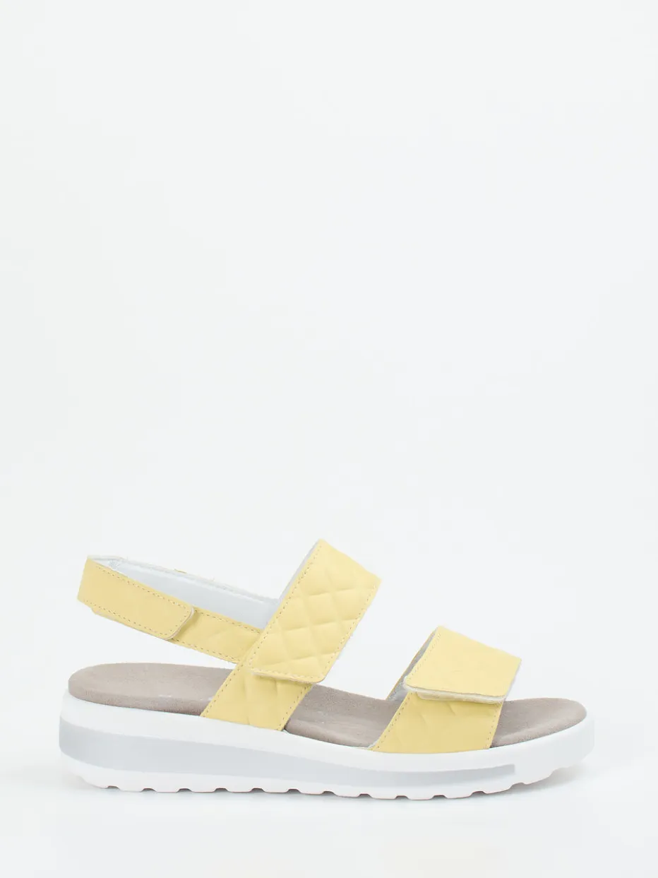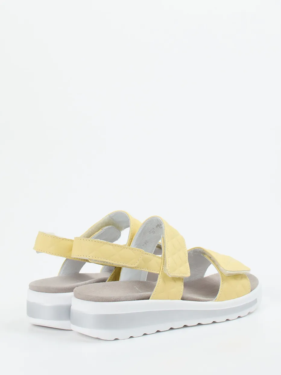 Leichtigkeit trifft Komfort in Pastell.Semler interpretiert die Damen-Kategorie Komfortsandalen sommerlich und modern. Für entspannte Tage im Freien oder zu Hause bietet diese gelbe Sandale ein ergonomisch geformtes Fußbett mit austauschbarer Einlage. Geprägtes Leder mit matter Steppung verleiht dem Modell eine hochwertige Haptik, während praktische Klettverschlüsse und ein Fersenriemen individuellen Halt garantieren. Die weiße Luftpolstersohle mit hellgrauem Kontrastrand trägt zur Leichtigkeit bei und passt zum zurückhaltenden Design. Trendtypisch wirkt der Look durch Soft Pastels und gesteppte Details. Kombiniert mit Leinenhose oder Sommerbluse entsteht ein relaxter Gesamtauftritt. Wertige Schuhtechnik und stilvolle Klarheit in einem modernen Sommerschuh von Semler.
