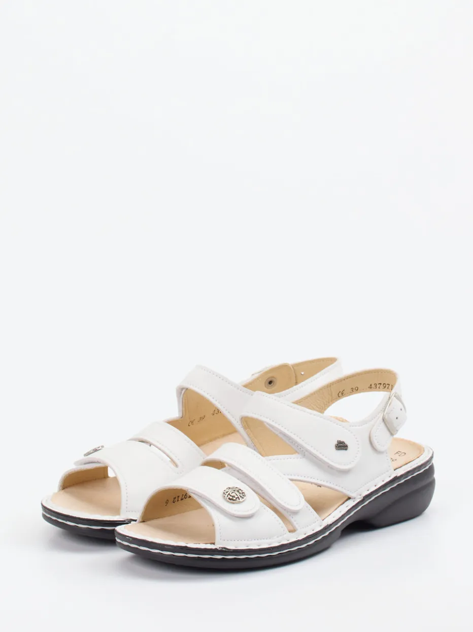 Bequem durch Alltag und Freizeit.Finn Comfort präsentiert mit dieser Komfortsandale ein hochwertiges Modell für anspruchsvolle Damen. Die weiß gehaltene Sandale aus Kalbleder mit matter Oberfläche überzeugt durch drei Klettverschlüsse und einen verstellbaren Fersenriemen mit silberfarbener Schließe – ideal für eine passgenaue Einstellung. Die ergonomisch geformte PU-Sohle mit 2,5 cm Absatz unterstützt ein angenehmes Laufgefühl, während Kontrastnähte und dekorative Zierelemente dezent Akzente setzen. Funktional inspiriert, gleichzeitig minimalistisch im Design, fügt sich der Schuh mühelos in komfortorientierte Sommer-Looks ein. Individuell anpassbar, langlebig bequem – mit Finn Comfort Qualitätsschuhwerk.