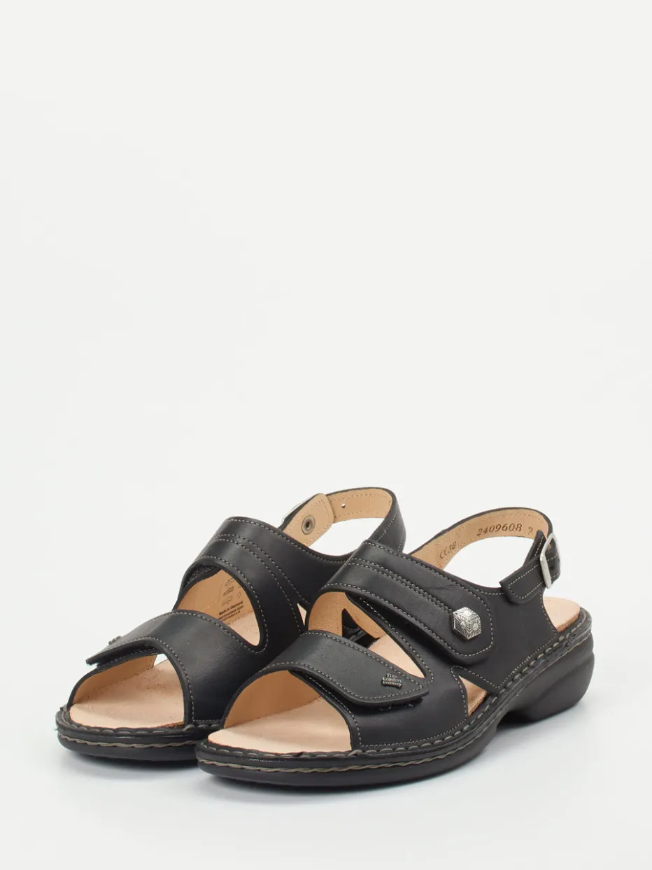 Komfort für jeden Sommertag.Finn Comfort bietet mit dieser Komfortsandale ein hochwertiges Damenmodell für Alltag und Zuhause. Die schwarze Sandale aus weichem Kalbleder überzeugt mit einer matten Oberfläche und einem atmungsaktiven Lederfutter. Durch drei Klettverschlüsse und einen verstellbaren Fersenriemen mit Druckknopfschließe lässt sie sich passgenau anpassen. Das lederbezogene Wechselfußbett unterstützt ergonomisch und ist ideal für Einlagen. Dezente Ziersteppungen, silberfarbene Metallelemente und eine rutschhemmende PU-Sohle runden das funktionale Design ab. Perfekt für Casual-Looks und sommerliche Relax-Momente. Langlebiger Tragekomfort – typisch Finn Comfort.