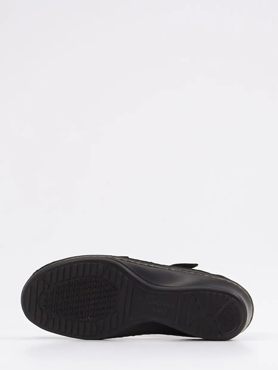 Für Komfort-Liebhaberinnen mit Stil.Finn Comfort bietet mit dieser Komfortsandale in Schwarz eine zuverlässige Begleiterin für Alltag und Freizeit. Die weich gearbeiteten Riemen aus samtigem Kalbleder mit mattem Finish lassen sich individuell per Klettverschluss anpassen. Cut-Outs am Vorderblatt schaffen angenehme Belüftung an warmen Tagen, während die geschlossene, leicht gepolsterte Ferse für einen stabilen Sitz sorgt. Das lederbezogene, ergonomisch geformte Wechselfußbett unterstützt die Fußgesundheit, kombiniert mit einer rutschhemmenden Gummisohle und keilförmiger PU-Sohle. Ideal für komfortorientiertes Styling mit entspannter Note. Ein authentischer Wohlfühlschuh mit Fokus auf nachhaltiger Verarbeitung und Tragequalität.
