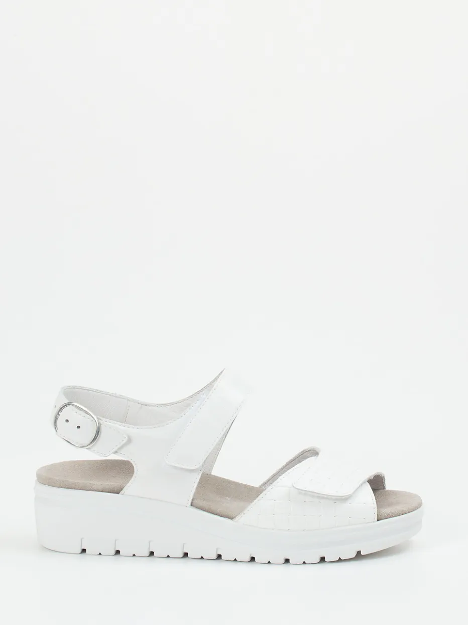 Semler präsentiert eine Damen-Komfortsandale mit Fokus auf Funktion und Stil. Aus robustem Kalbleder gefertigt, kombiniert diese weiße Sandale mit samtig gepolsterter Velours-Innensohle und ergonomischer Keilsohle Komfort mit minimalistischer Ästhetik.