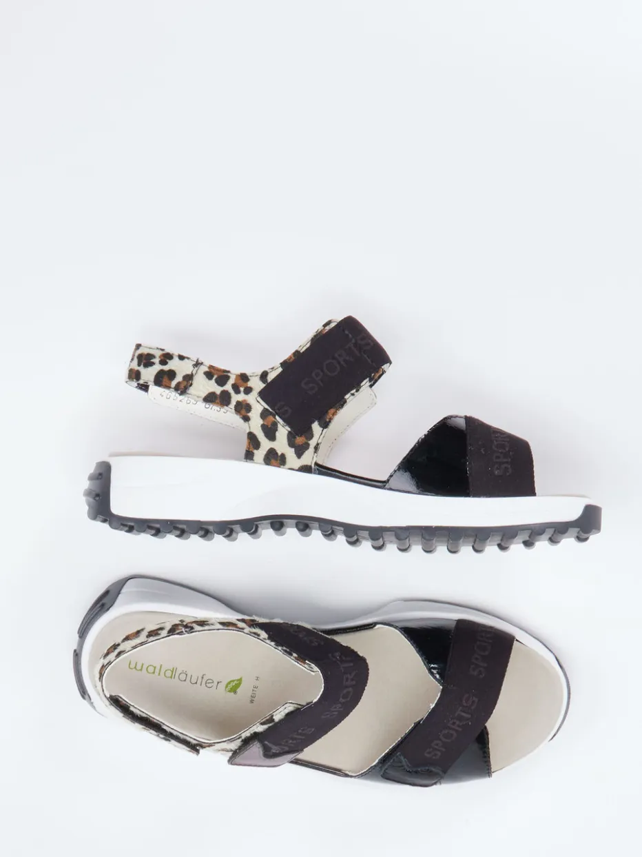Das schwarze Lackleder trifft auf samtig bedrucktes Druckleder in Leo-Optik und verleiht den offenen Riemensandalen einen auffälligen Streetwear-Charakter. Klettverschlüsse mit ‚SPORTS‘-Schriftzug sorgen für einfaches Anpassen, während die profilierte Gummisohle mit Luftpolster Trittfestigkeit und Dämpfung garantiert. Dank ihrer Weite H und wechselbarer Einlegesohle eignen sich die Sandalen auch für orthopädische Einlagen. Kombiniert mit leichter Sommermode ein stylischer Akzent.